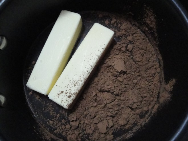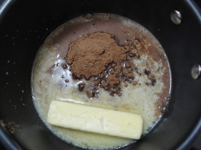 Add butter, cocoa, and buttermilk to a saucepan and bring to a boil.