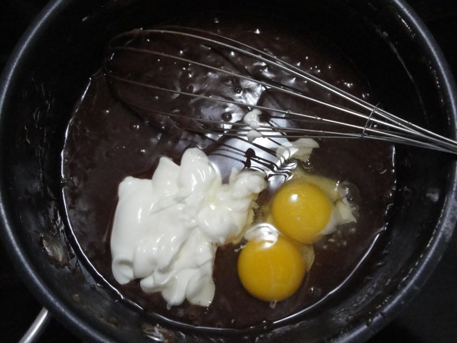 Bring butter, water, and cocoa to a boil in a saucepan.