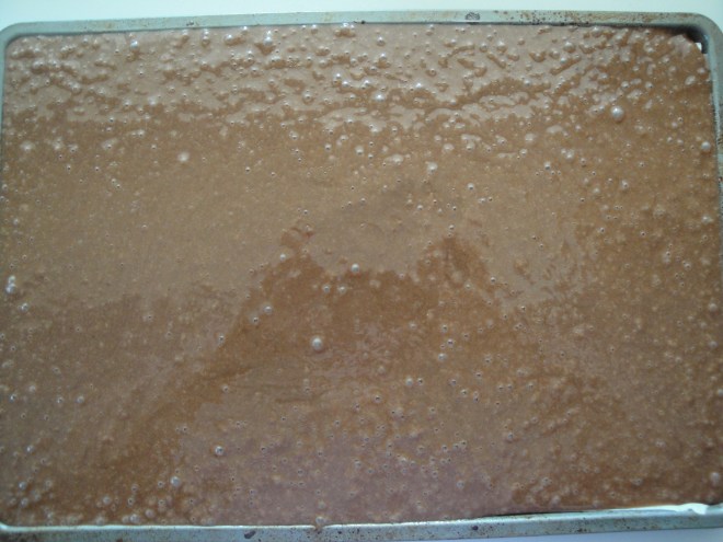 Pour the batter into a sheet pan and bake at 375ºF (Tip: make sure your pan isn’t as shallow as mine was or you might end up with frosting all over your counter…just sayin’!)