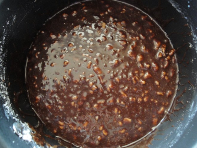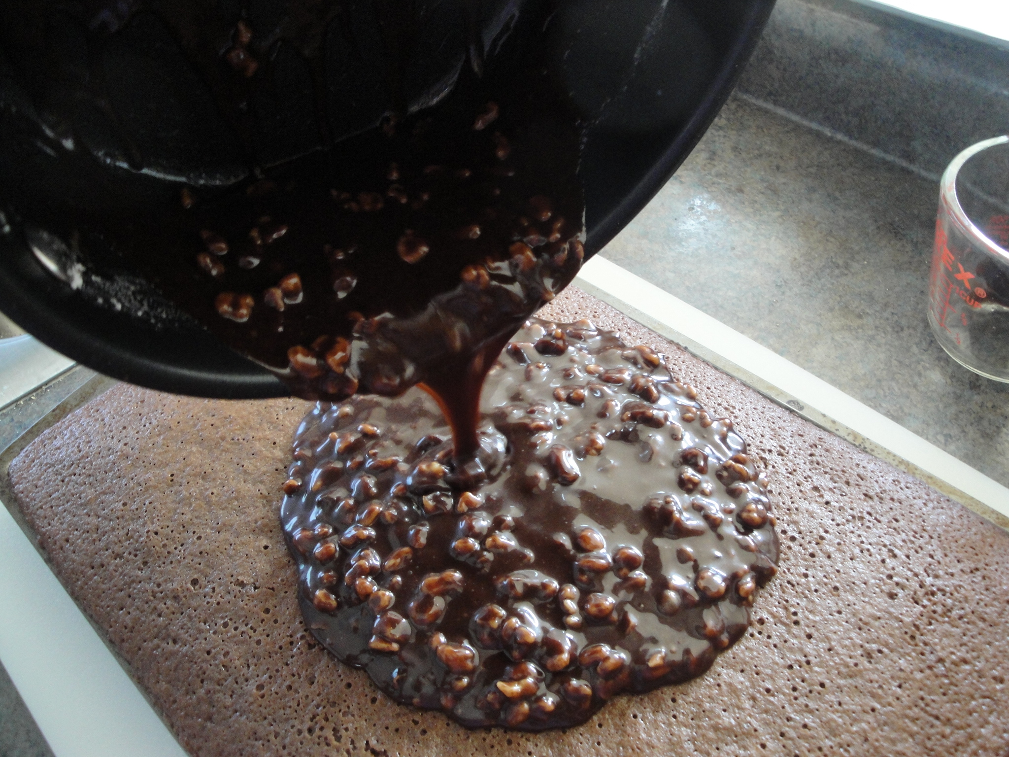 Carefully pour the cooked frosting over the cooled cake (again, make sure your pan is deep enough to contain the frosting!).
