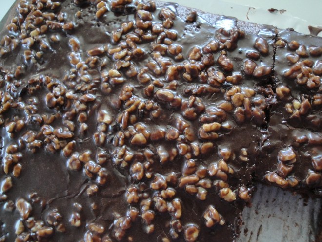 Some of you may have never heard of Texas Sheet Cake but it’s a thin, rich chocolate cake that I remember my mom making frequently when I was little. The cake itself isn’t uber-chocolatey like a death-by-chocolate cake but it doesn’t need to be. The batter is spread out onto a cookie sheet, baked thin, and covered with a velvety, sinful layer of more chocolate goodness. The frosting is the real star of this show. Butter, cocoa, and buttermilk are cooked together and then blended with powdered sugar, vanilla, and walnuts. As it cools on the cake, it thickens while still staying creamy and decadent. Texas Sheet Cake isn’t just a chocolate cake – it’s THE chocolate cake to make. Think of it like a lighter (in texture, not calories!) version of a frosted brownie. Whether you made it with your mom like I did or if you’ve never tried it before, please put it on your to-do list.