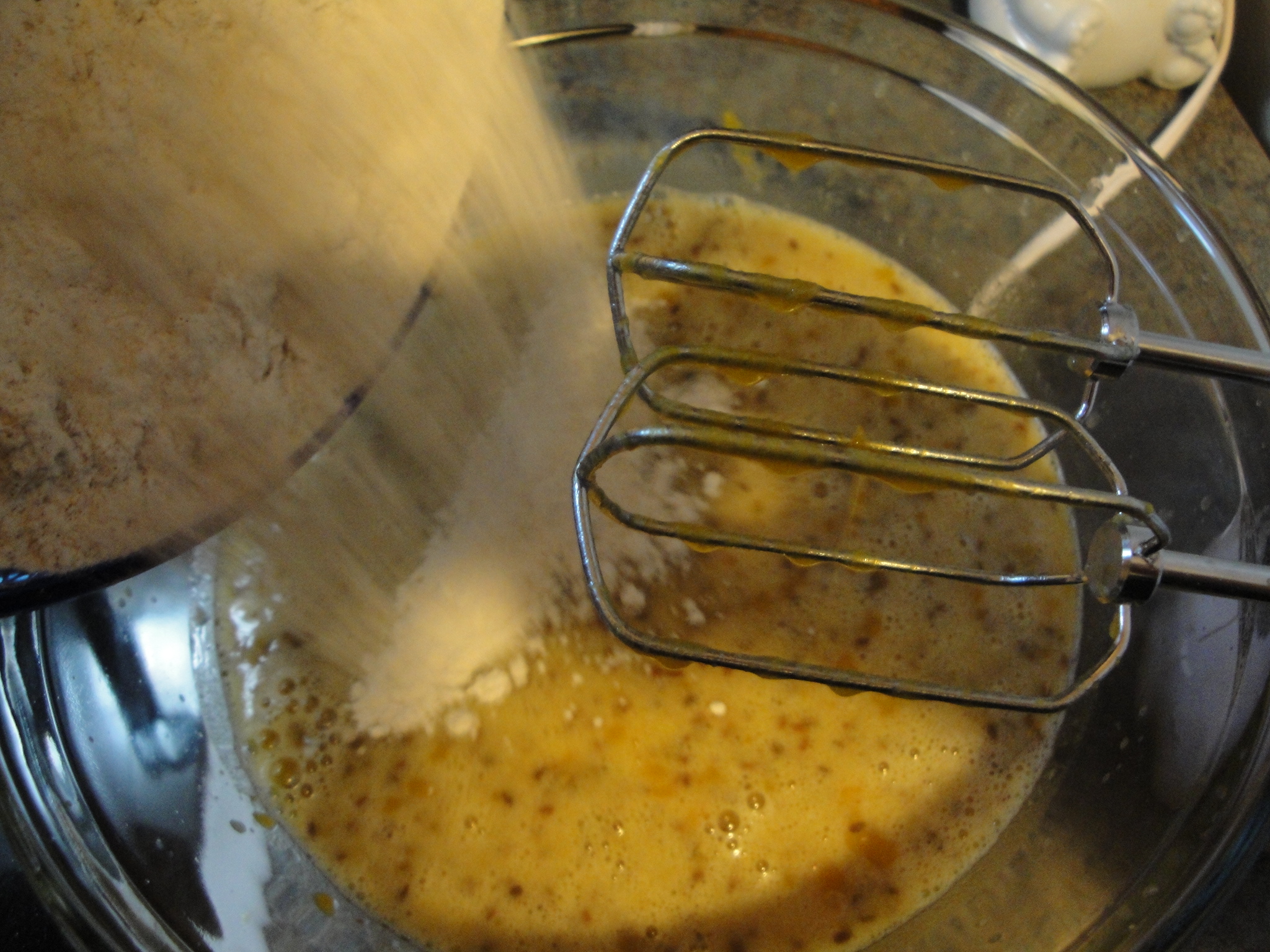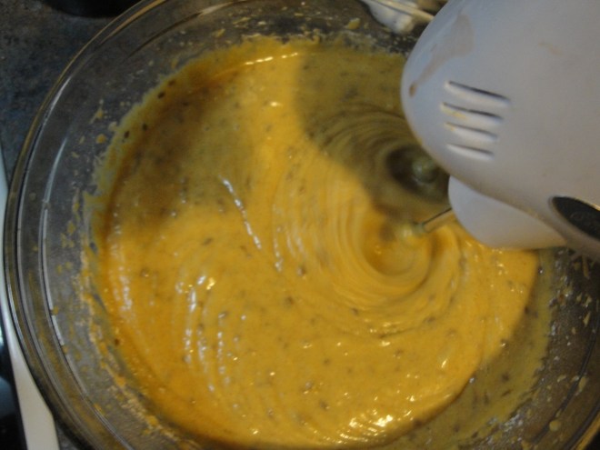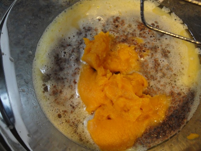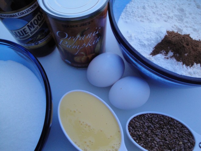 In another bowl, mix together sugar, oil, beer, eggs, flaxseed, water, and pumpkin. Is it just me or does it look like there is a wicked old witch in the pumpkin in this picture?? Weird!