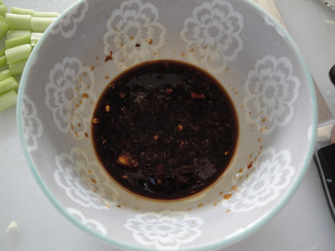 While chicken cooks, make the stir-fry sauce by mixing together soy sauce, ginger, garlic, dark brown sugar, and crushed red pepper in a small bowl.