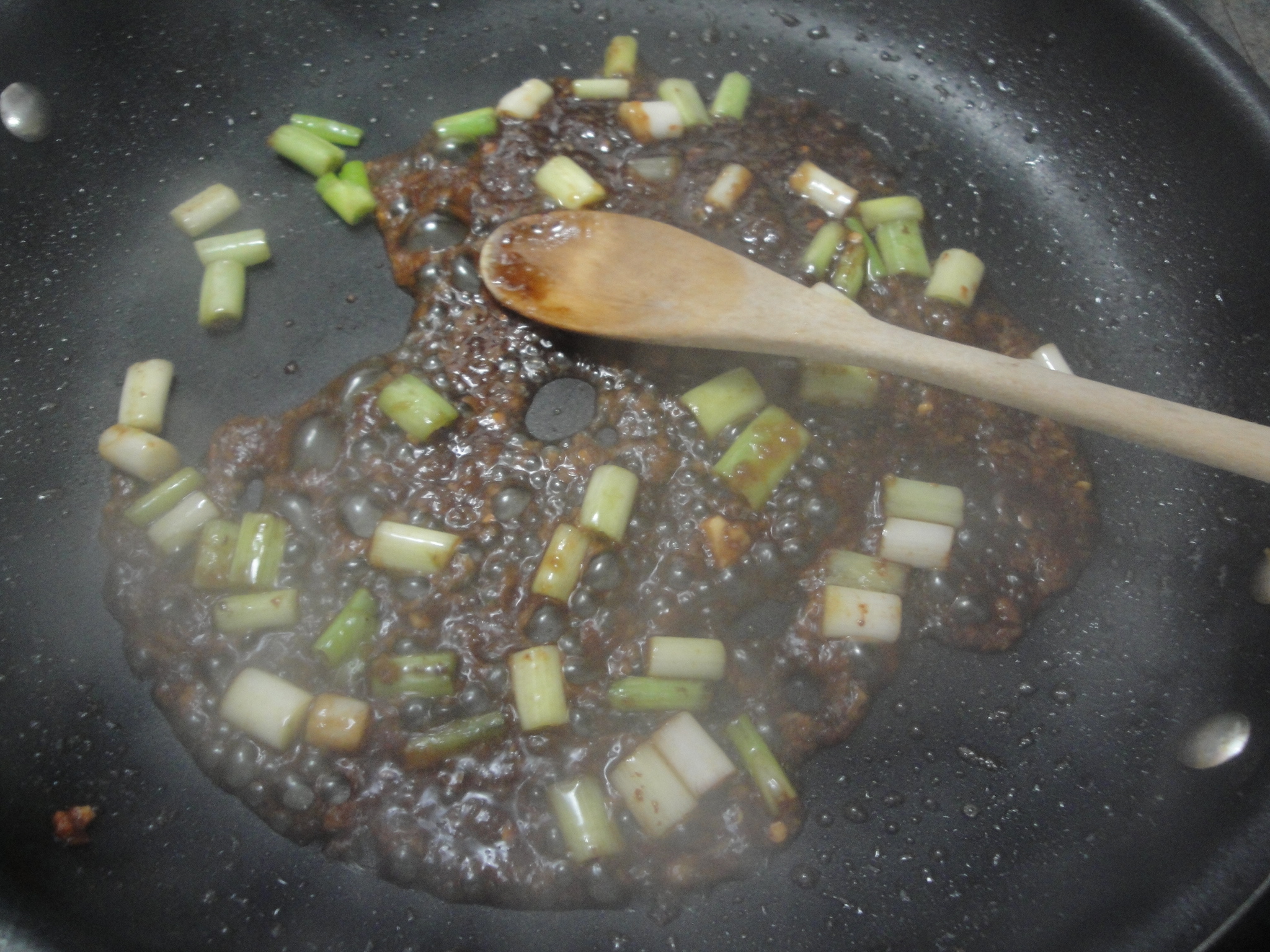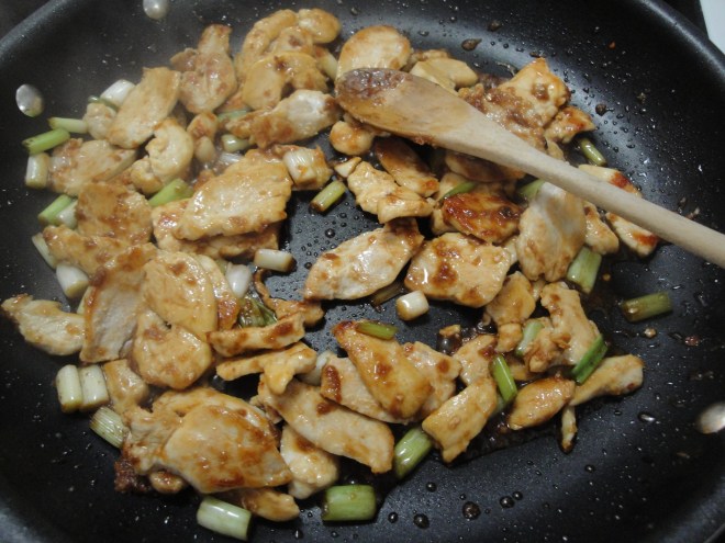 Remove cooked chicken from the pan and set aside. In the same pan, add green onions and stir-fry sauce and cook briefly.