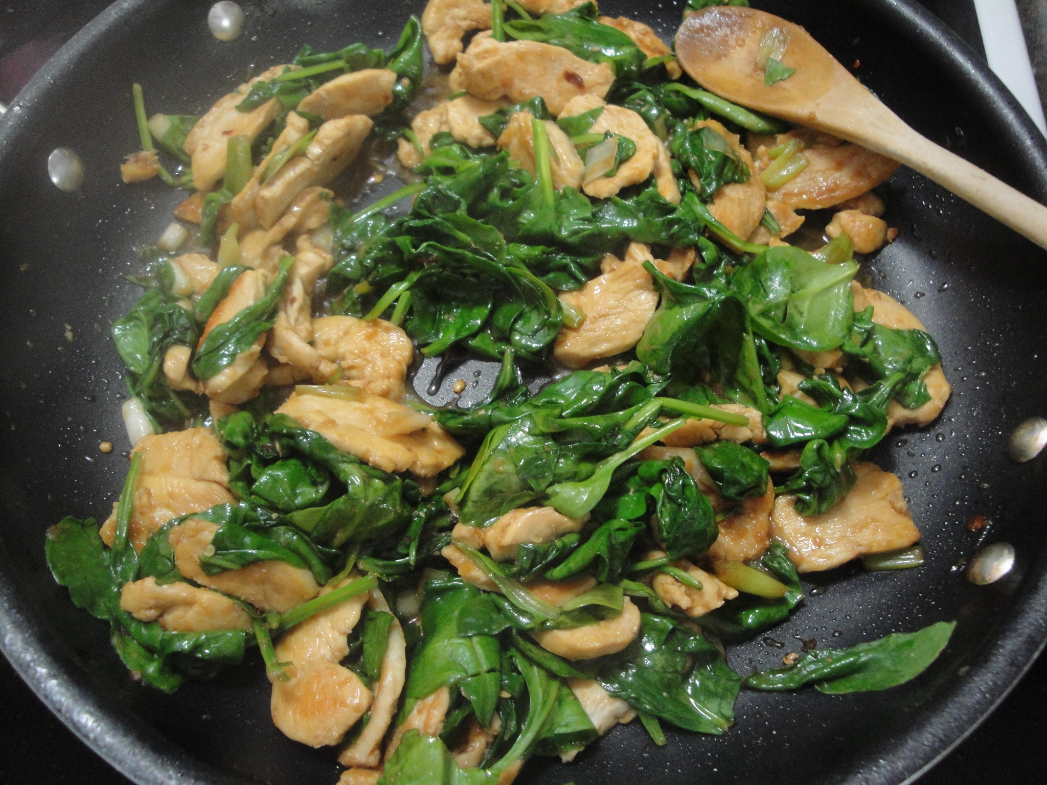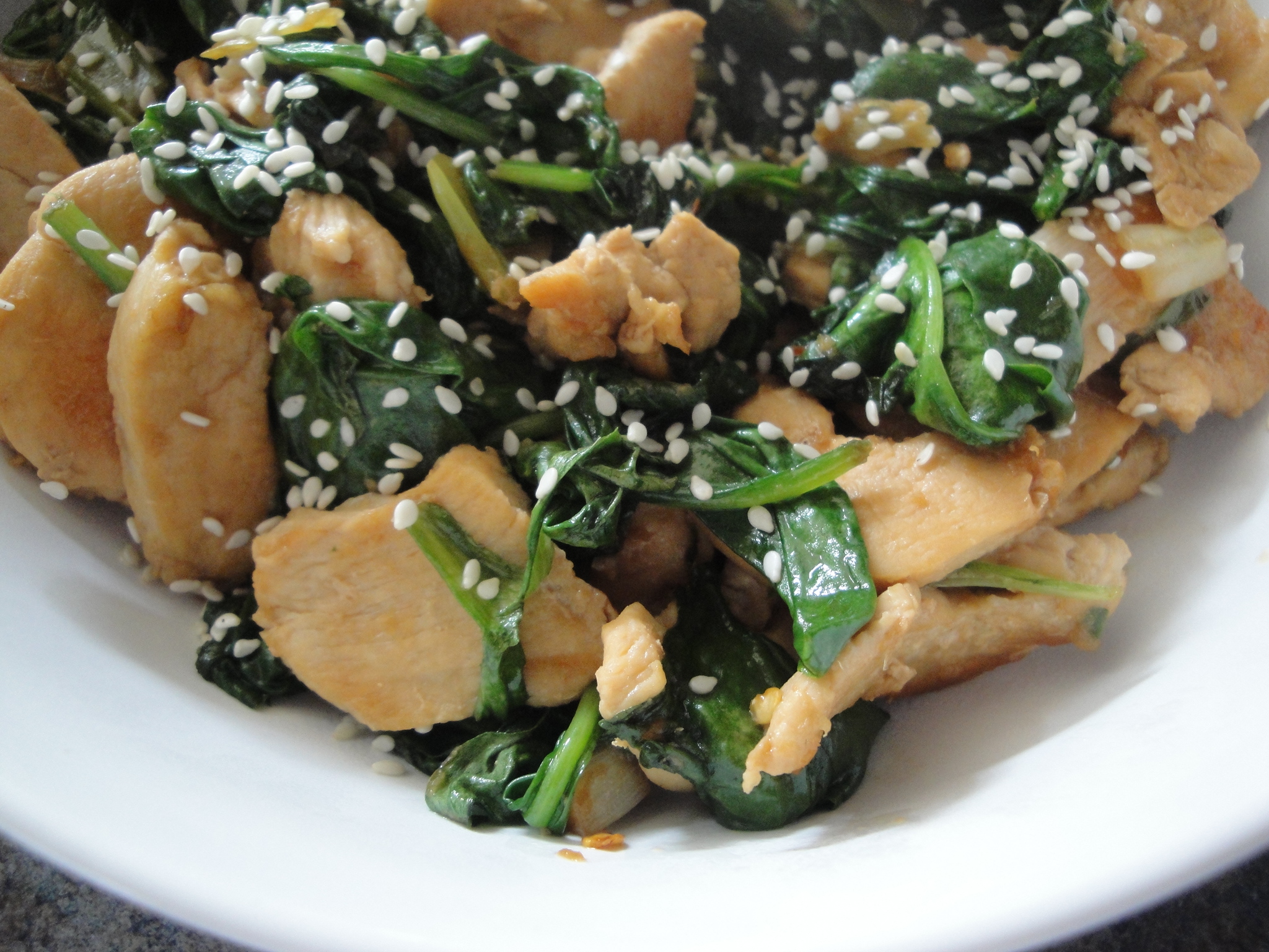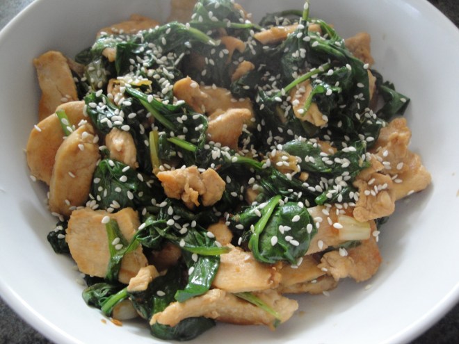 I’m a sucker for stir-fry so this Sesame Chicken Stir-Fry was a no-brainer. The original recipe from Cooking Light is actually a beef stir-fry but since I don’t eat beef, I adapted it to my liking and boy, do I like it! Thin slices of chicken are cooked and then mixed with a salty, sweet, spicy sauce and then with baby spinach. Yum! If you are watching your carbs, or even if you aren’t, please consider making this. You could easily serve it over rice to make it an even heartier meal but I like it just the way it is. The stir-fry sauce is very tasty with ginger, garlic, soy sauce, brown sugar, and crushed red pepper. Because crushed red pepper doesn’t give me the kick of heat that I usually want, next time I make this (and there will be a next time!) I’ll probably substitute it with hot chili sauce like sriracha or cayenne pepper but if you have a sensitive tongue, you can leave it out altogether. If you don’t like spinach, the versatility of this recipe allows you to switch up the ingredients. Try making it with broccoli, or if you want it make it vegetarian, try this sauce with any of your favorite veggie combinations.