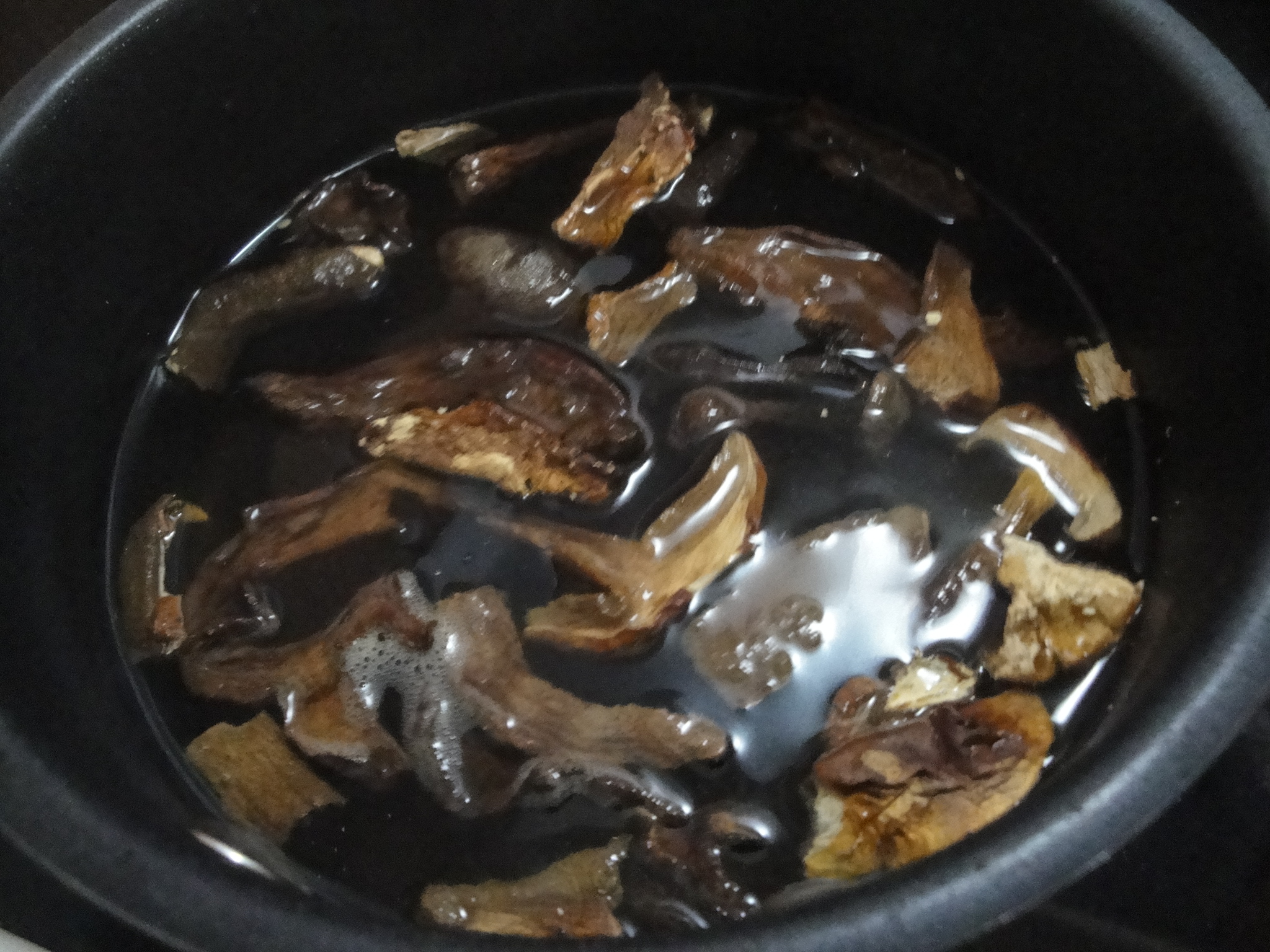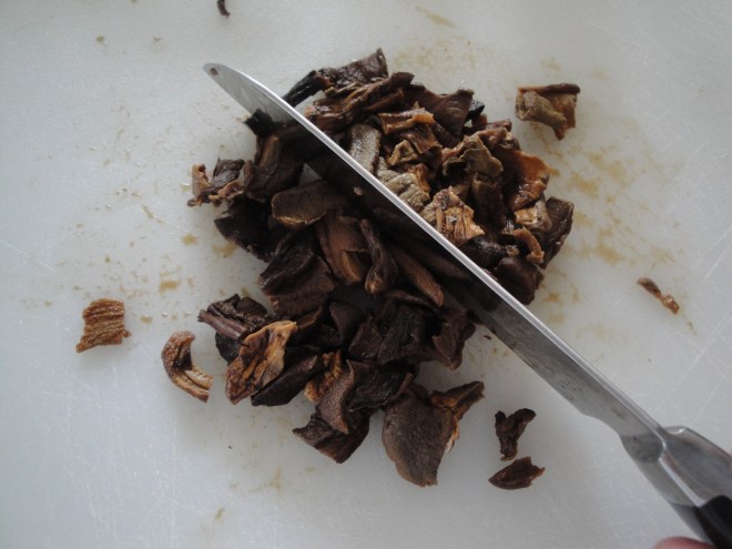 Reconstitute the dried mushrooms in boiling water for 30 minutes.  Drain the mushrooms, reserving the mushroom water.  Combine 1 1/2 cups of the liquid with chicken (or beef) broth and simmer in a small saucepan.  Chop mushrooms and set aside.