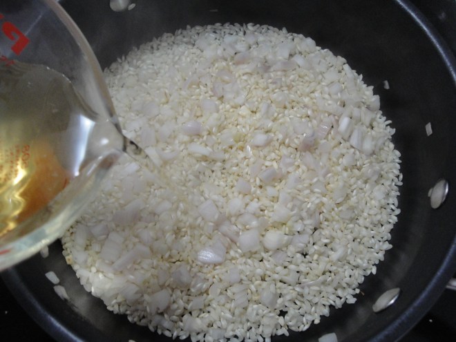 In a large saucepan, sauté rice, garlic, and shallot for 5 minutes.  Add in the white wine and cook until it evaporates.