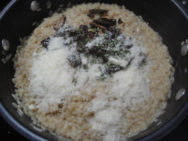 Once all broth has been completely absorbed, add in chopped mushrooms, parmesan cheese, thyme, salt, and pepper.  Stir to combine until cheese melts.