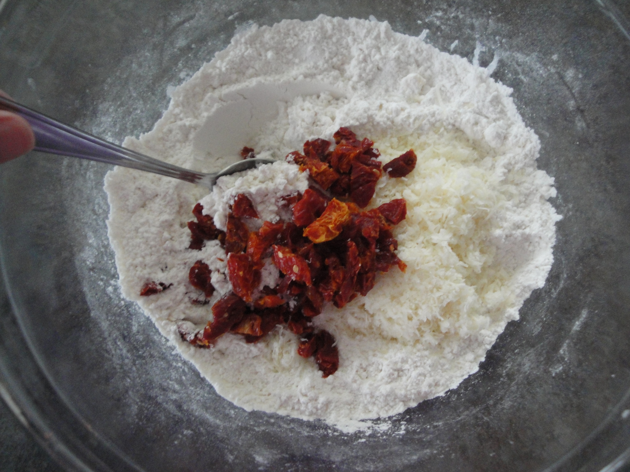 Mix in chopped sun-dried tomatoes, shredded cheese, and basil.