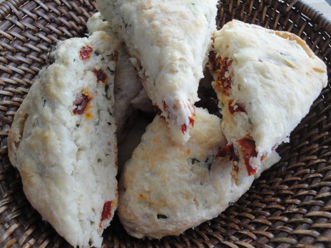 When I was 24, I lived in Denver, Colorado, worked two jobs and lived paycheck to paycheck. Since I couldn’t afford to eat out at restaurants, I cooked at home a lot and ended up often making scones. I’m not really sure why but I think this was the beginning of my curiosity on how to make food I’d never made before. Now, whenever I make scones, I think of that tiny kitchen in that tiny studio apartment on Poet’s Row that I called home. I thought of that time again when I made these Manchego, Herb, and Sun-Dried Tomato Scones. Scones are a quick bread and since they don’t have yeast, they are easy to make. These are baked with sun-dried tomatoes, manchego cheese, and basil. The sun-dried tomatoes are little bursts of flavor in these scones, the basil adds an herby freshness and the cheese provides a slightly nutty undertone. Eat these plain, toasted, or with a little butter for breakfast, as a snack or a nice side to any dish.