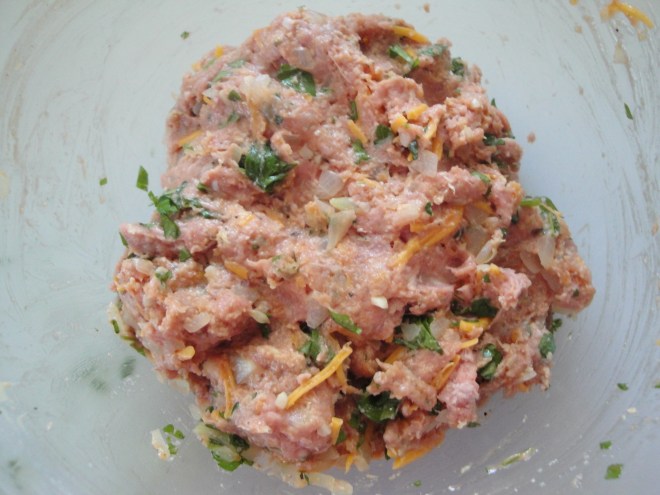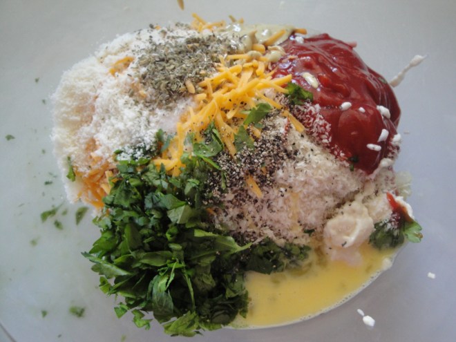 Add cooked onions and garlic to a bowl with ground turkey and all other ingredients except for half of the ketchup. Mix ingredients together with your hands, careful not to overmix.
