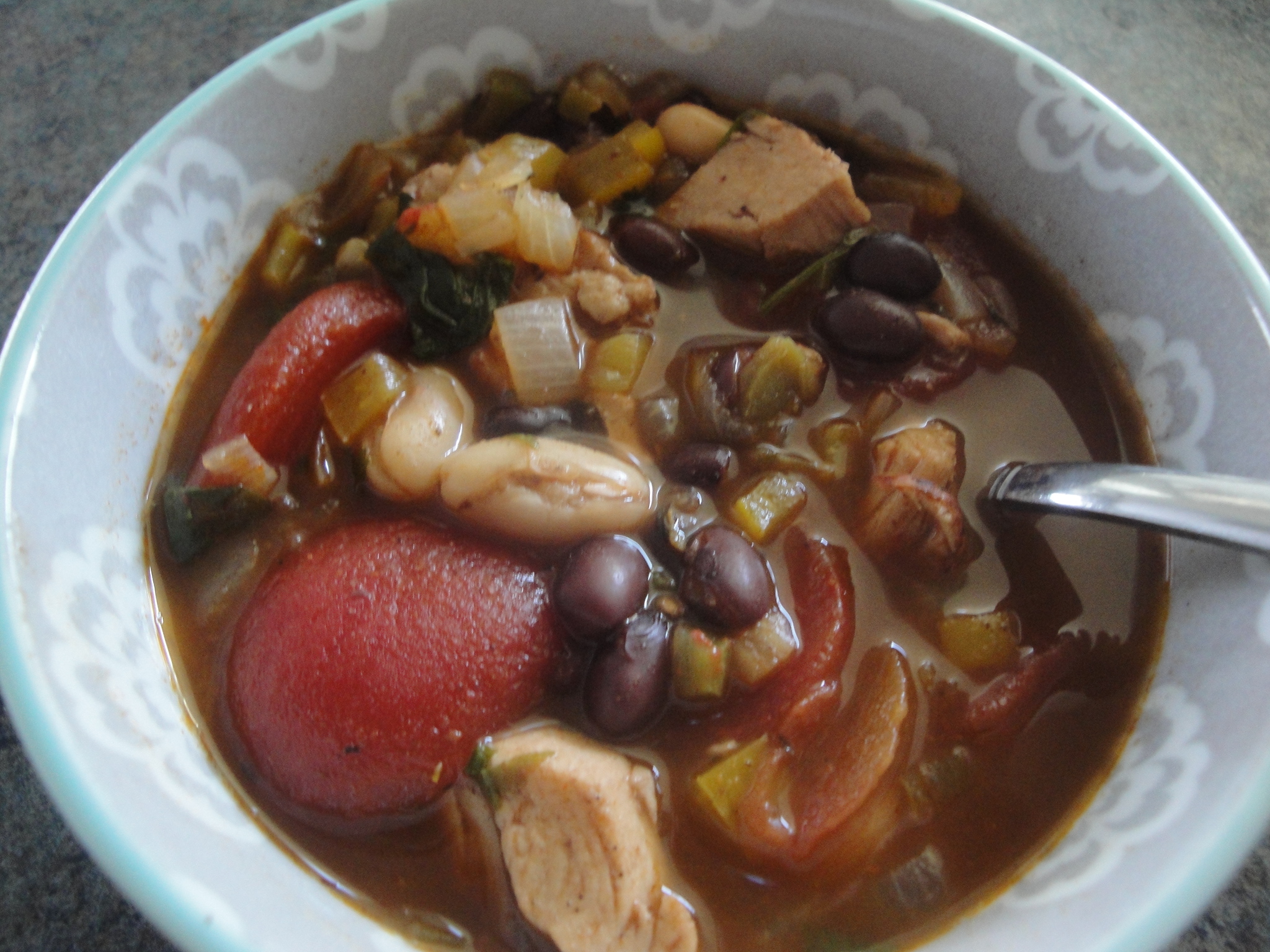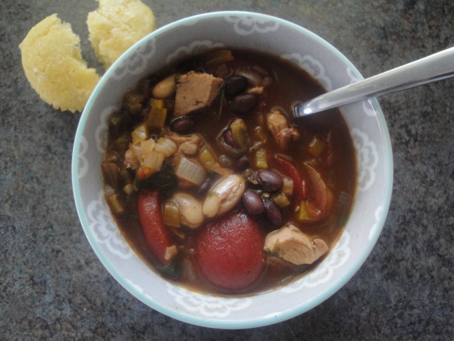 Chili is usually a recipe that I make the first weekend that football starts, no matter what the temperature is outside. So, making chili in November is pretty late for me. But this recipe for Jerk Chicken Chili was worth the wait. This recipe came from Glamour Magazine – a surprising source of tasty recipes. This chili is different than your regular chili but still just as hearty and comforting. The spices in this chili – chili powder, thyme, allspice, cinnamon – are cooked with onion and yellow pepper early on which brings out their natural oils and intensifies their flavor. Chicken is added and coated with the spice mixture before being simmered with the liquids, beans, and jalapeño. Fresh cilantro and (surprise!) chocolate are added at the end to deepen the flavor of every bite. I left the garlic out of this recipe for one reason only: the editors at the magazine included it in the directions but didn’t include it in the ingredients! Ugh! Anyway, the flavor in this chili goes deep to create an intense, soothing chili that digs down and warms you to the core. If you’re bold enough to try a different kind of chili, you won’t be disappointed with this!