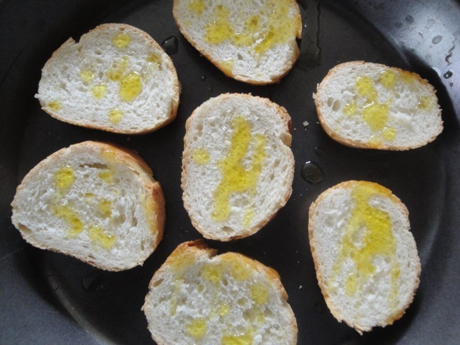 Preheat the broiler. Cut bagette into 1/4 inch slices and put into a baking dish. Drizzle with olive oil and place under broiler for a few minutes until golden brown.
