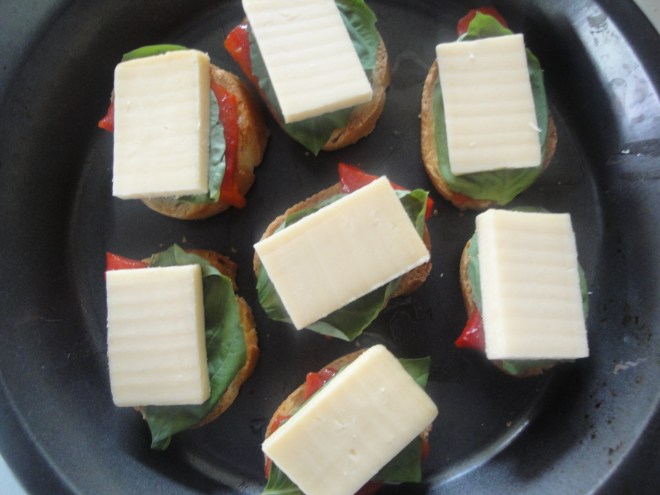 Remove bagette slices from the oven and top each piece with a piece of roasted red pepper and basil.