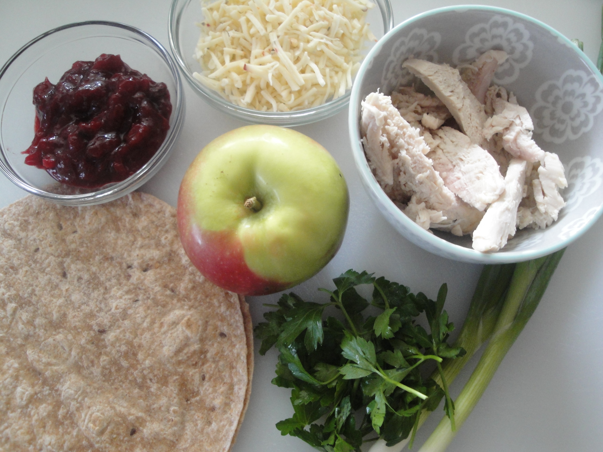 Layer chopped turkey and 1 tablespoon each parsley and scallions on each tortilla.
