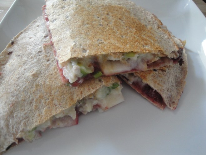 I made my own cranberry sauce this year for Thanksgiving and I will never buy canned or premade cranberry sauce again because mine turned out perfect (see note below for the link to the recipe I made). Unfortunately, of the six people who came to my house for dinner, only my aunt and I ate any of it which meant that I basically had an entire bowl leftover in my fridge. I figured, what a better way to take care of some leftovers than to throw them in a quesadilla? As a result, I came up with these Turkey, Cranberry, and Pepper Jack Quesadillas. Cranberry sauce, turkey, sliced apples, scallions, parsley, and pepper jack cheese are sandwiched between whole wheat tortillas and grilled until toasty brown. One thing I love about quesadillas is that they can be an appetizer, snack, or a light meal in a pinch. These quesadillas are sweet, tangy, and spicy and you’d never know they are from leftovers.