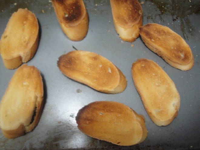 Meanwhile, broil baguette slices in the oven until toasted. In a small pan or skillet, add pecans and toast on a low heat until fragrant.