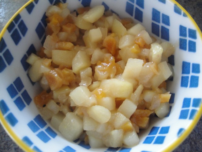 Add in chopped pears, dried apricots, sugar, cider vinegar, salt, and cinnamon stick. Bring to a boil and reduce to a simmer. Cook for 20 minutes and cool to room temperature.