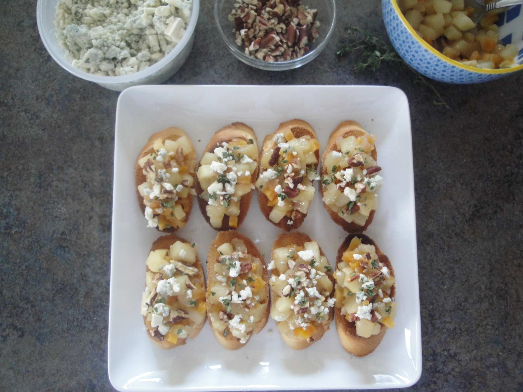 Top toasted baguette slices with pear topping, gorgonzola crumbles, chopped toasted pecans, and fresh thyme.