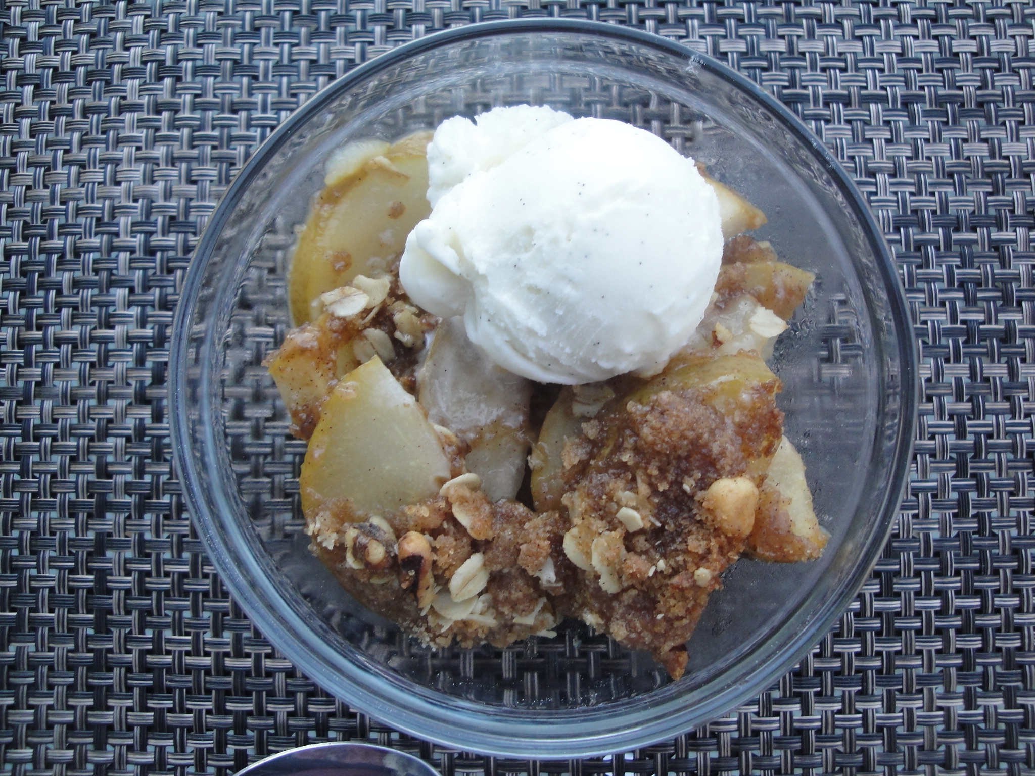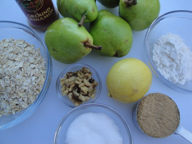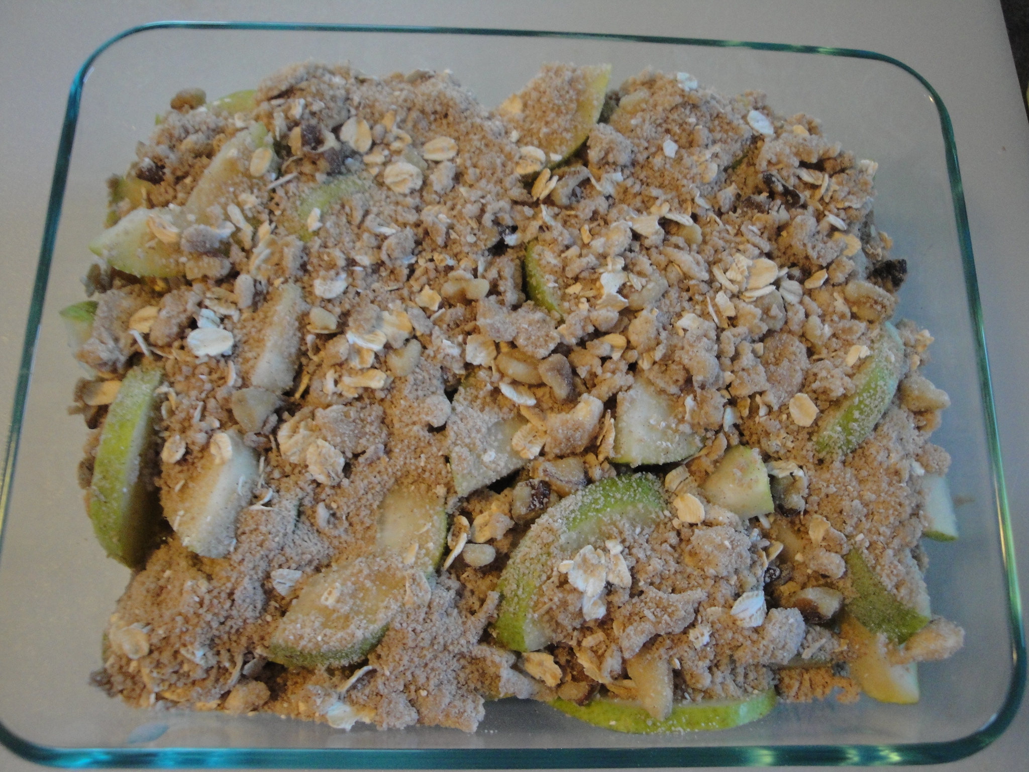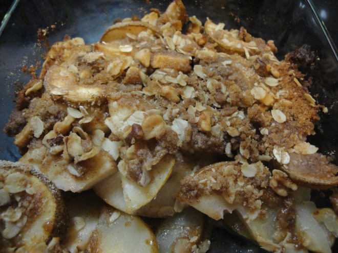 Pour crumble over pears in baking dish. Bake at 375°F until pears are tender (mine took 45 minutes).