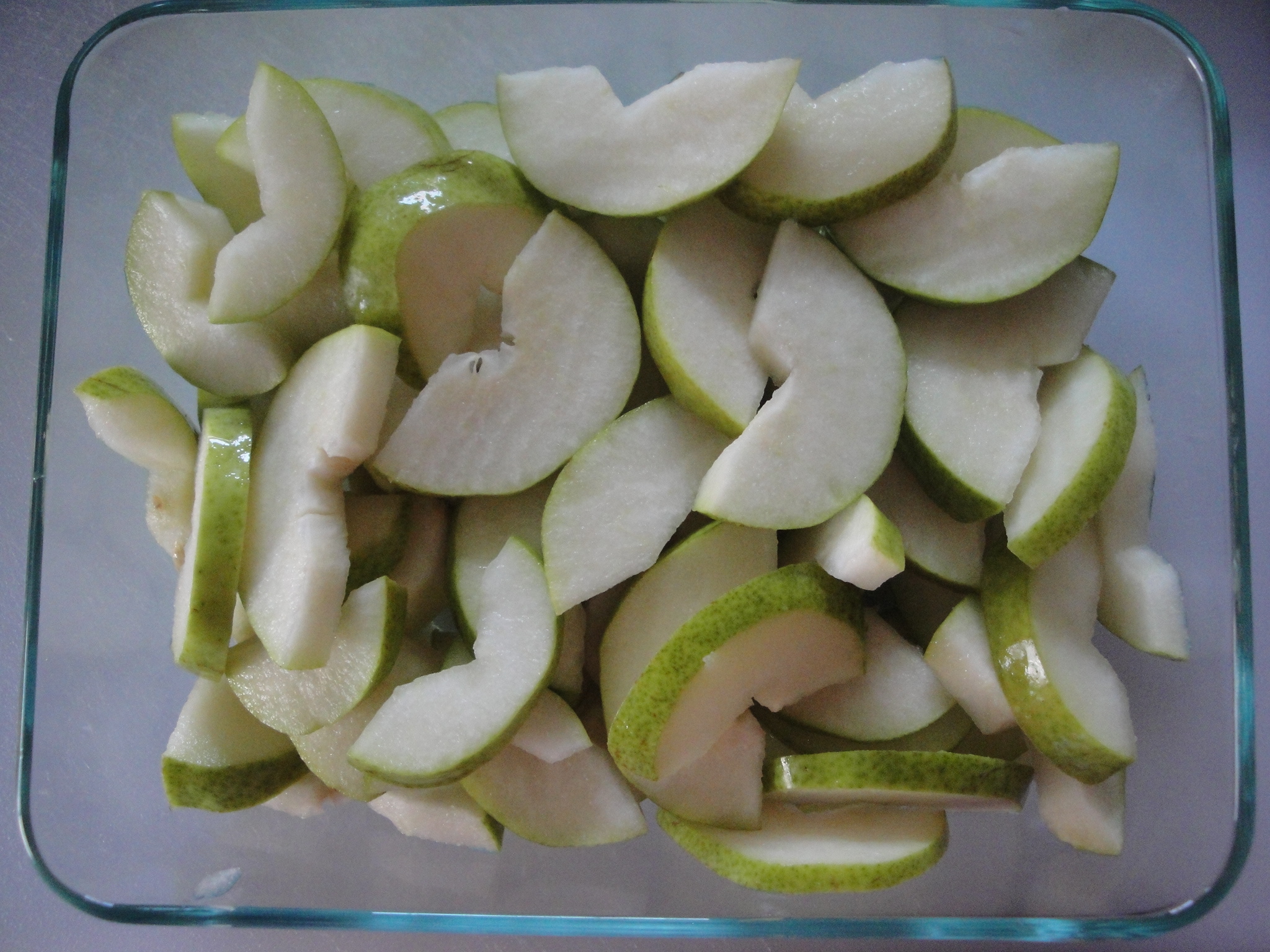 Slice the pears and mix them in a bowl with lemon juice (and sugar, cinnamon, and cornstarch if you choose to follow the recipe like I didn’t). Pour pear mixture into a baking dish.