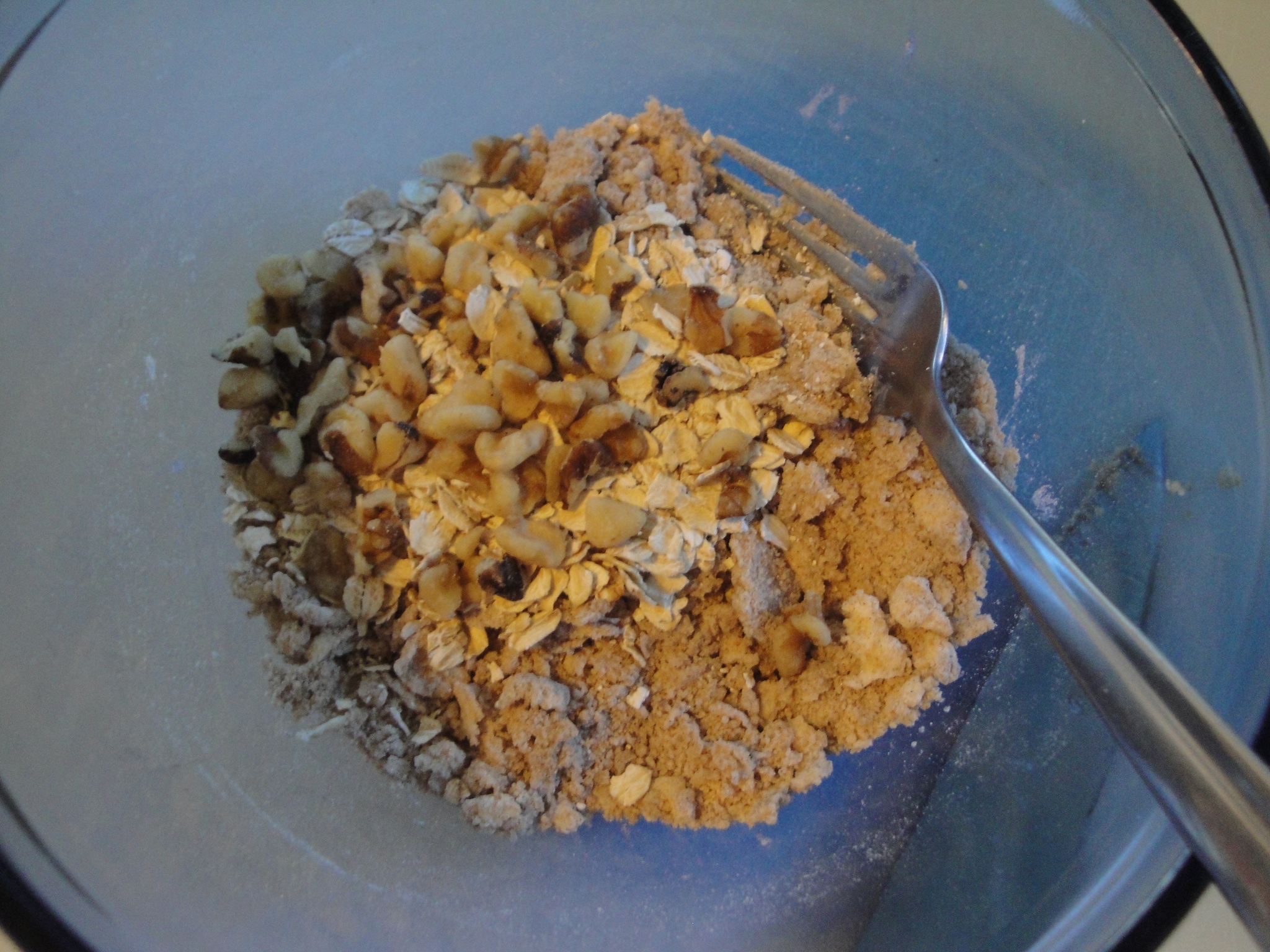 Cut in cold butter with a fork (or food processor). Mix in oats and chopped walnuts.