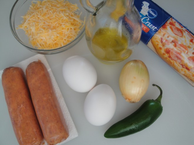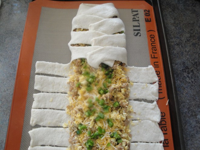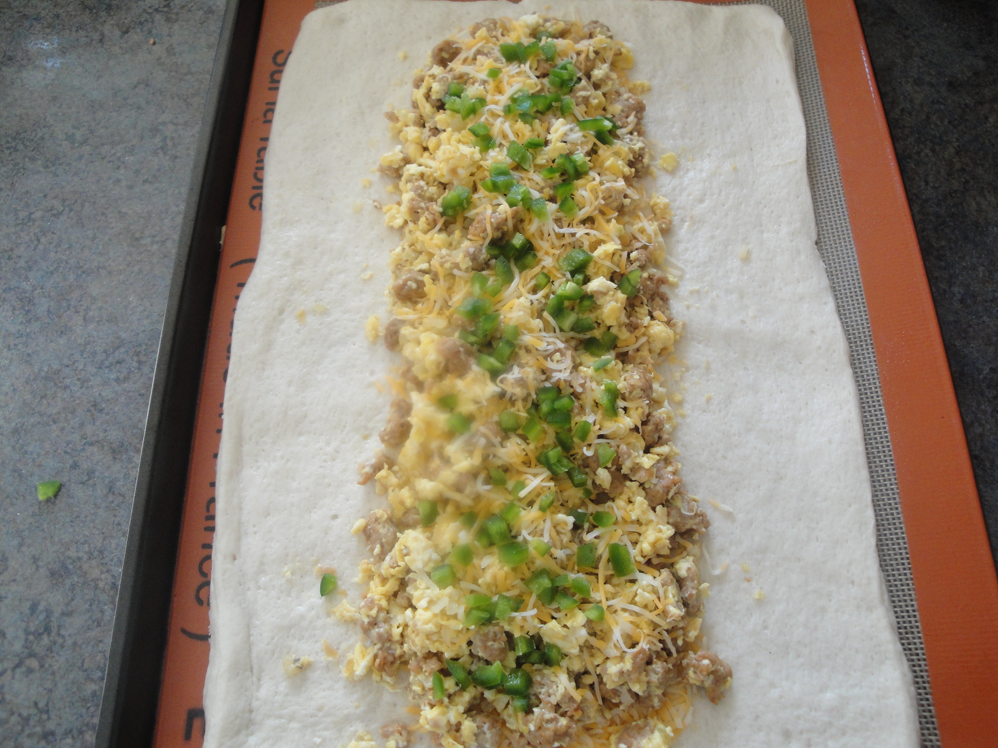 Unroll the pizza dough and shape into a rectangle on a baking sheet. Sprinkle cheese down the middle of the dough, leaving 2 inches on the sides. Top the cheese with the egg and sausage mixture, remaining cheese, and chopped jalapeño.