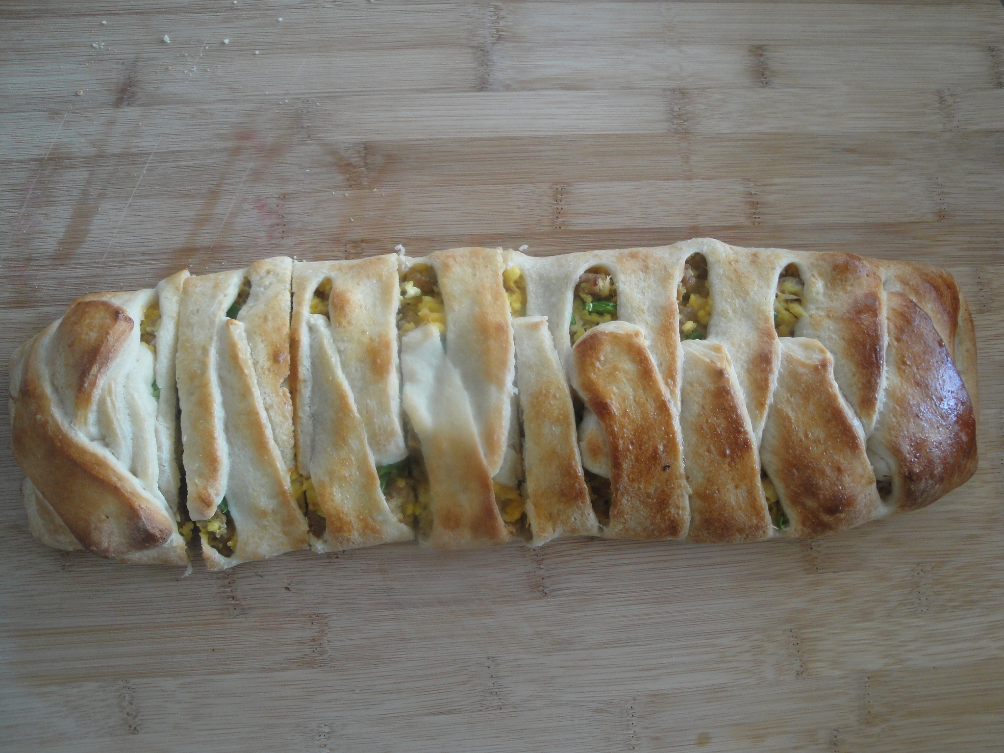 Using a sharp knife, cut slits into the sides of the dough, about an inch apart. Fold dough strips over the mixture diagonally, overlapping strips to look like a braid.