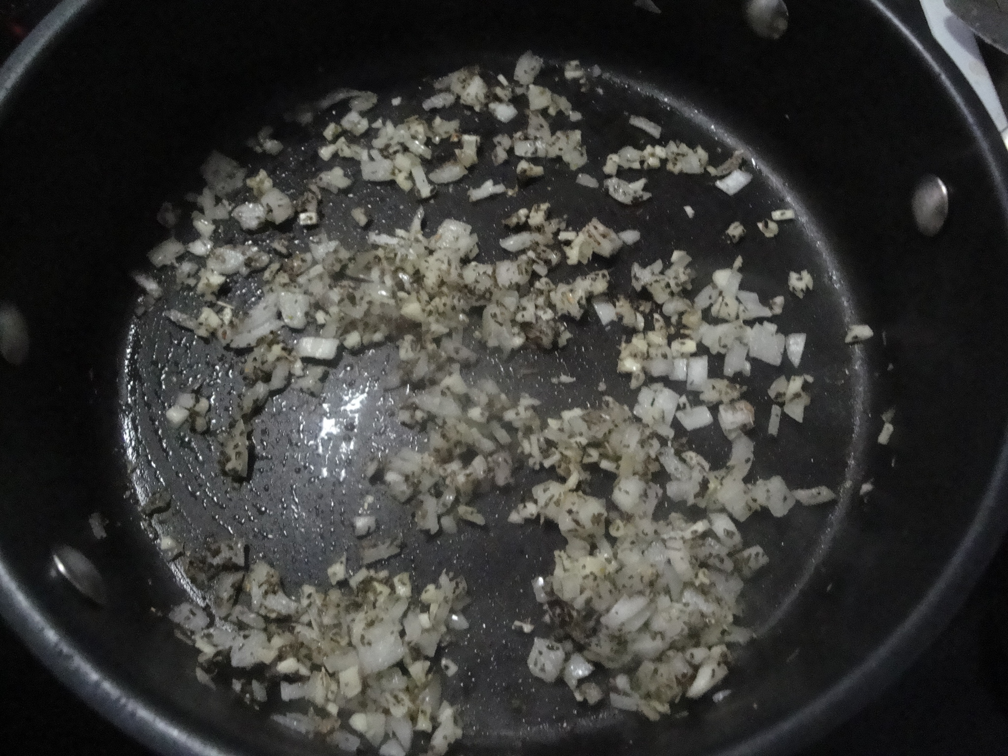 In a large saucepan, heat onion, garlic, basil, and oregano in olive oil until onion is tender.