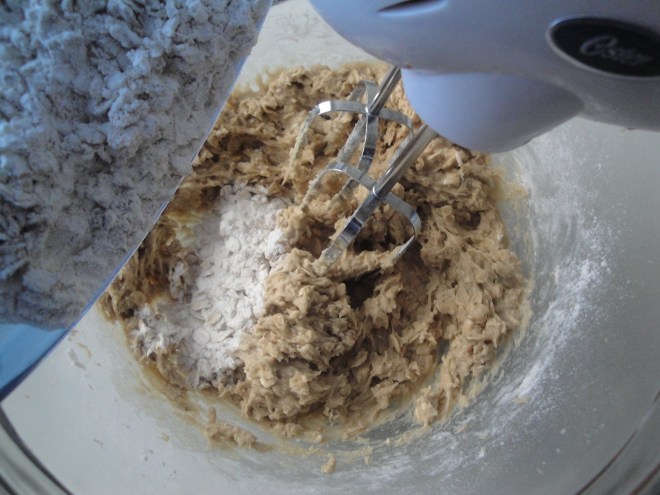 Combine flour, oats, baking soda, and salt in a bowl and set aside.