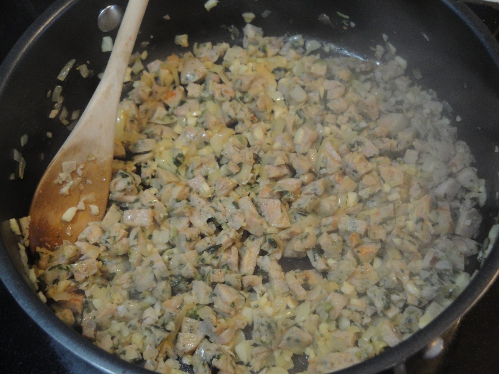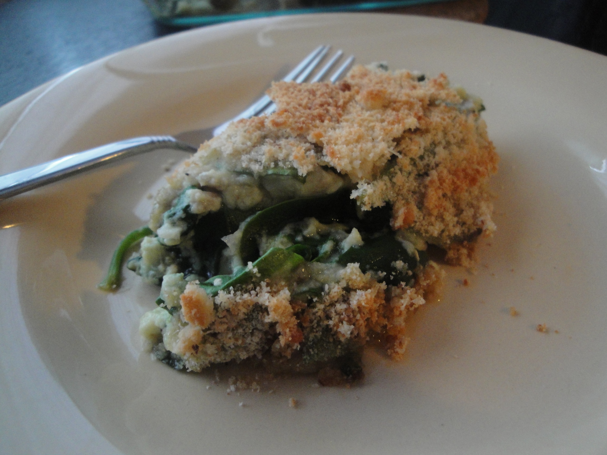 I can’t seem to get enough spinach lately, I’m not sure why. I’m not complaining though, there are worse things that I could be wanting to put in my body. This Garlicky Spinach-Sausage Gratin has tons of spinach and tons of garlic and satisfies that crazy spinach craving. Sausage is sautéed with onion and garlic, mixed with a combination of milk and egg, and stirred with gobs of fresh spinach to make a thick and creamy spinachy-custard. The topping of parmesan cheese and bread crumbs, once baked, provides a slight saltiness and subtle crunch to this hearty and comforting dish. I didn’t follow this recipe exactly and used precooked spinach-garlic chicken sausage (ironically, it’s what I had in the fridge) in place of the pork sausage, 1% milk instead of 2%, and store-bought bread crumbs instead of a fresh baguette. Leaving the sausage out and reducing the milk slightly might make this a good vegetarian dish or even a side to a meal. I liked this straight out of the oven as a meal in itself so next time you are craving spinach and want something other than salad, keep this in mind. With so much garlic though, you might want to keep a stick of gum nearby.