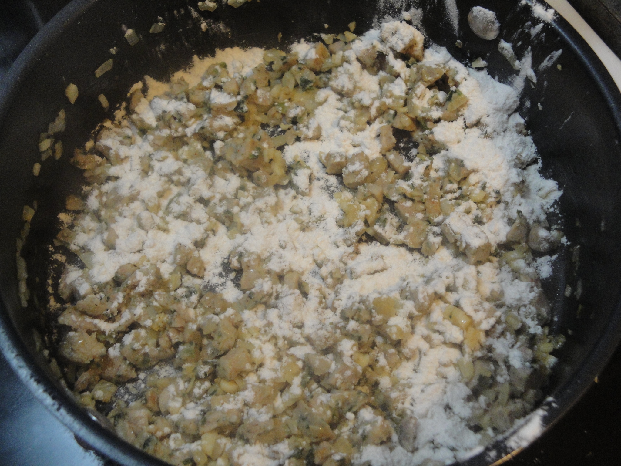 Add flour to the pan and cook for 30 seconds. In a bowl, combine milk and egg, stirring well. Add to the sausage mixture and bring to a boil, stirring constantly.
