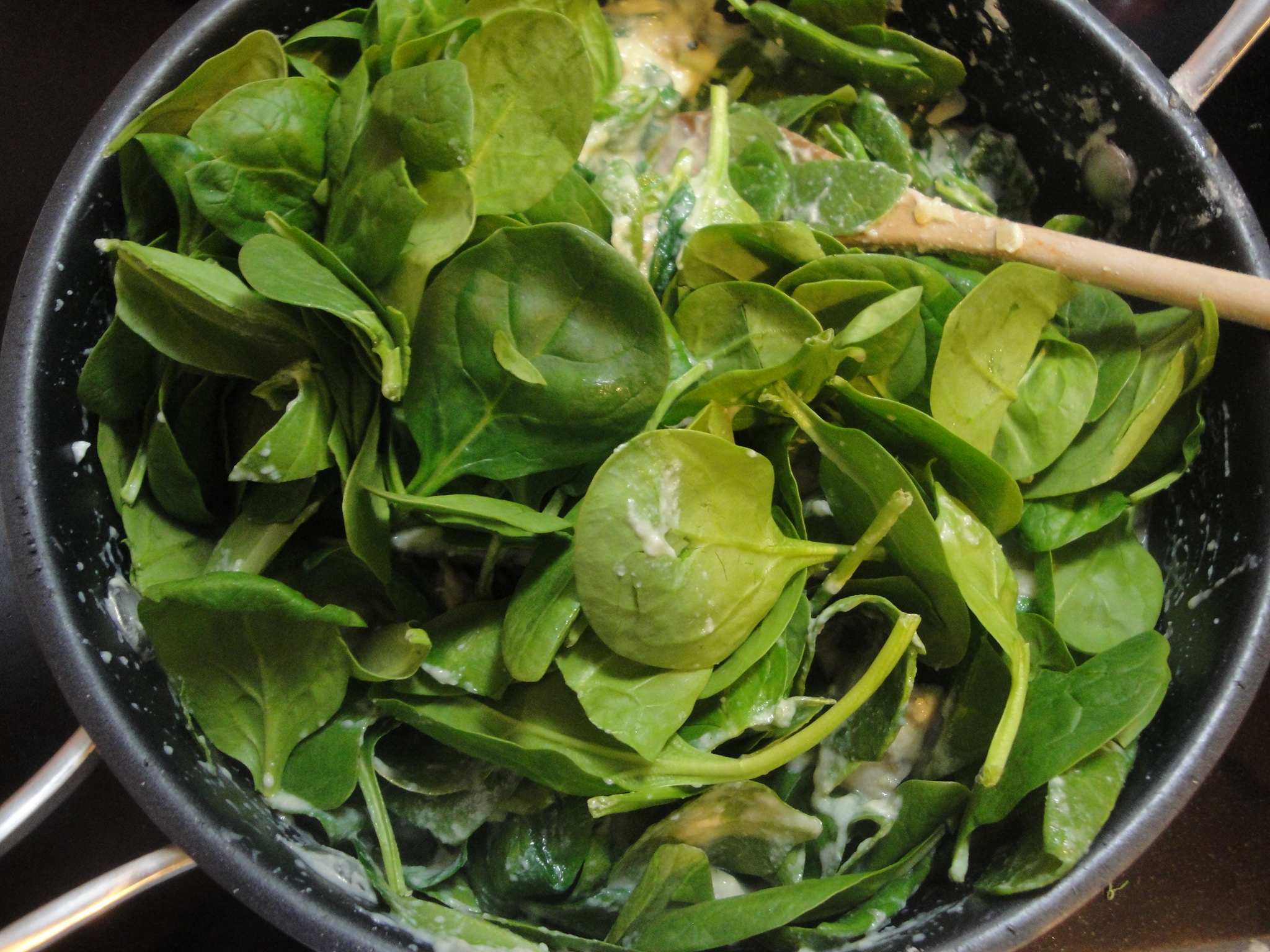 Remove pan from heat and add in two bags of spinach, one at a time. Stir together until spinach is wilted.