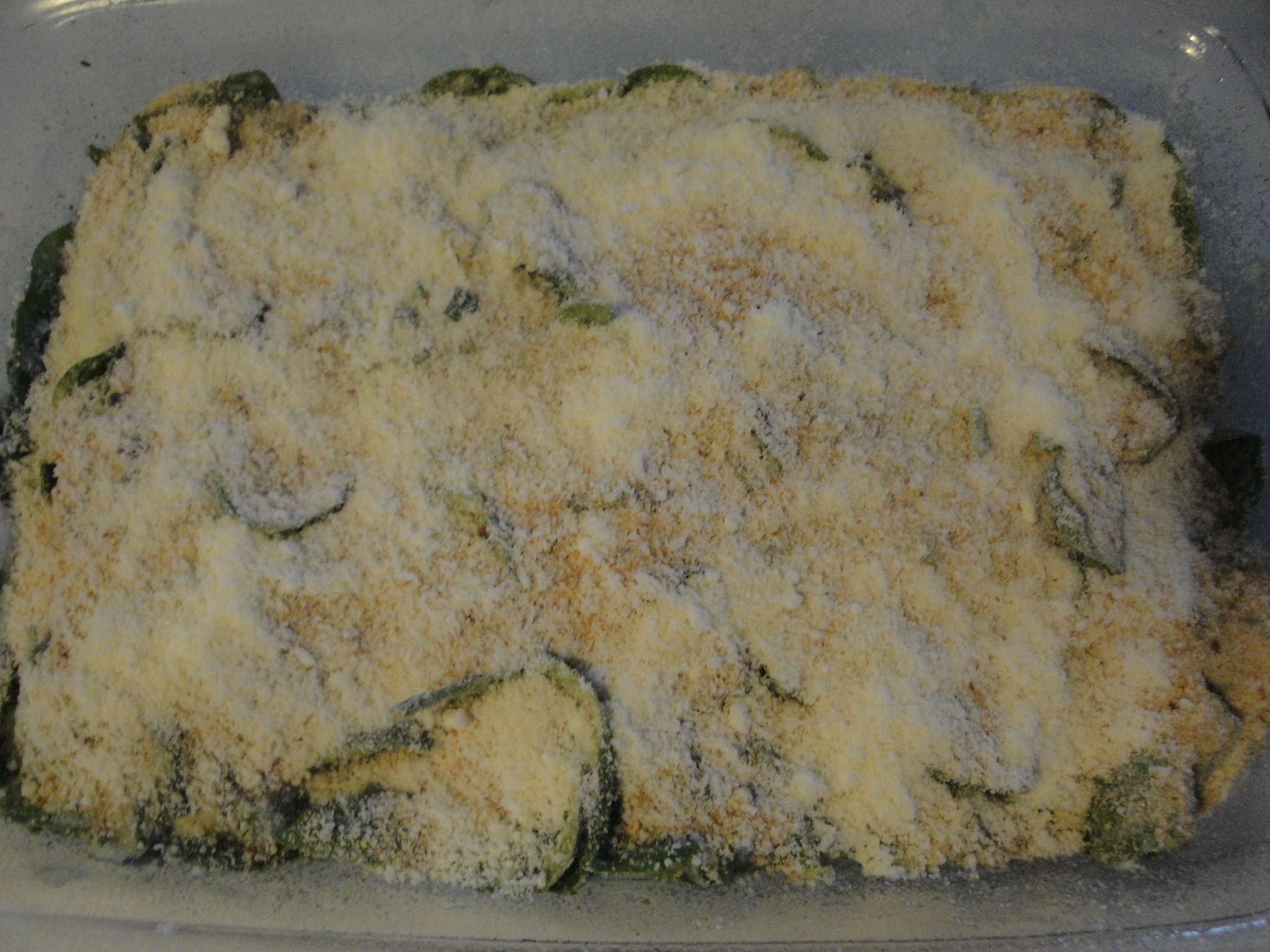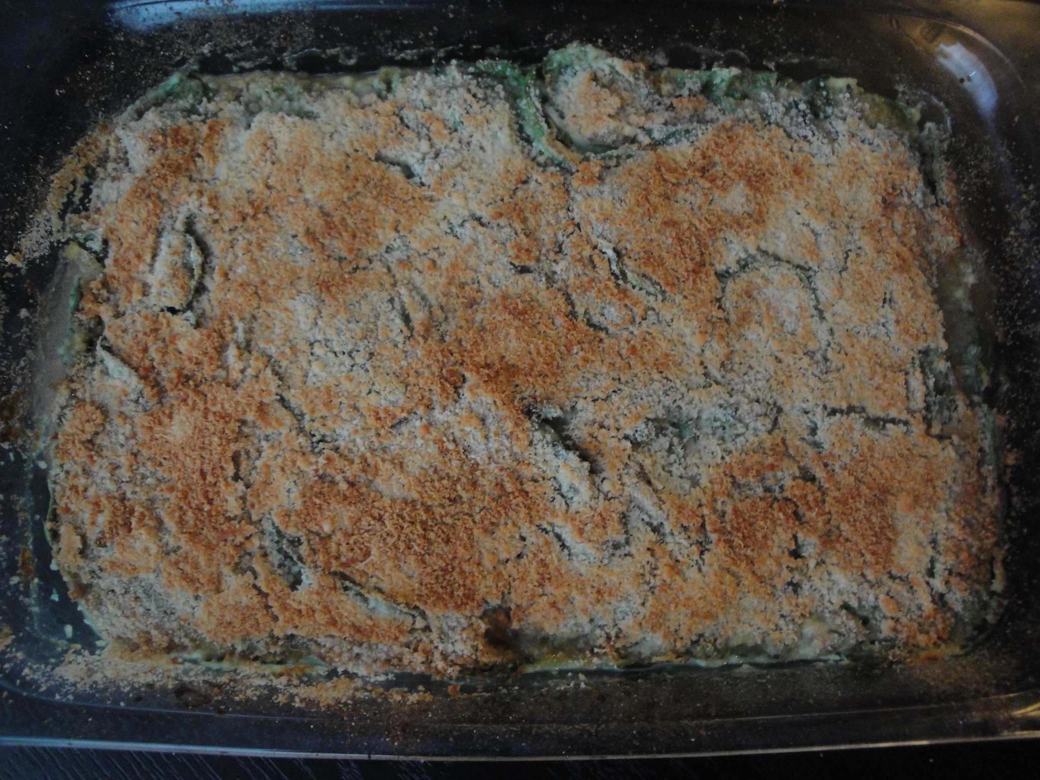Pour mixture into a baking pan and top with bread crumbs and parmesan cheese.