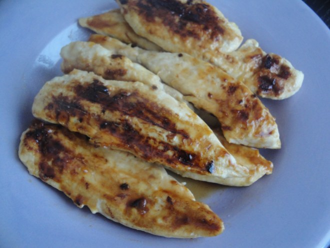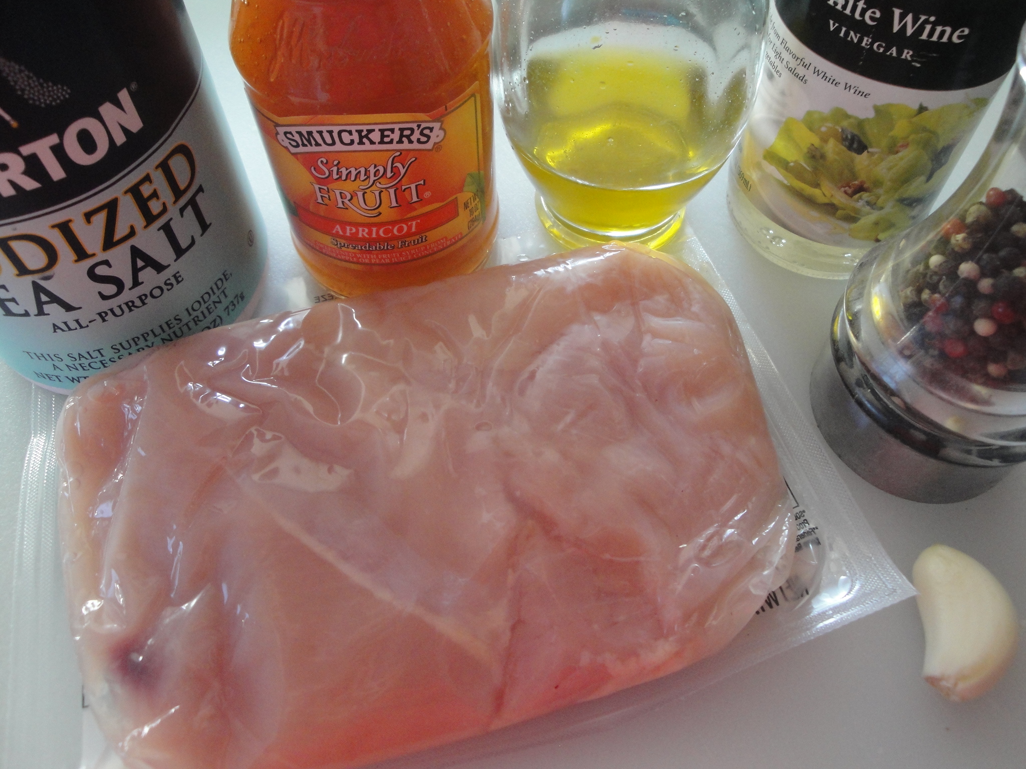 A mixture of apricot preserves, vinegar, olive oil, and garlic is brushed over chicken as it cooks making for a tasty, slightly sweet glaze. I used chicken tenderloins but you can use any chicken you like (the recipe uses chicken breasts, thighs, and drumsticks). Serve this with any vegetable, starch, or salad greens you like to make for a light and healthy meal.