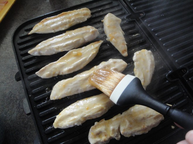 Cook one side of the chicken on a grill pan and turn over. Coat the cooked side with apricot glaze. When opposite side has cooked, flip the chicken over and apply glaze to the other side. I flipped the chicken over one more time to make sure all sides with glaze were cooked.
