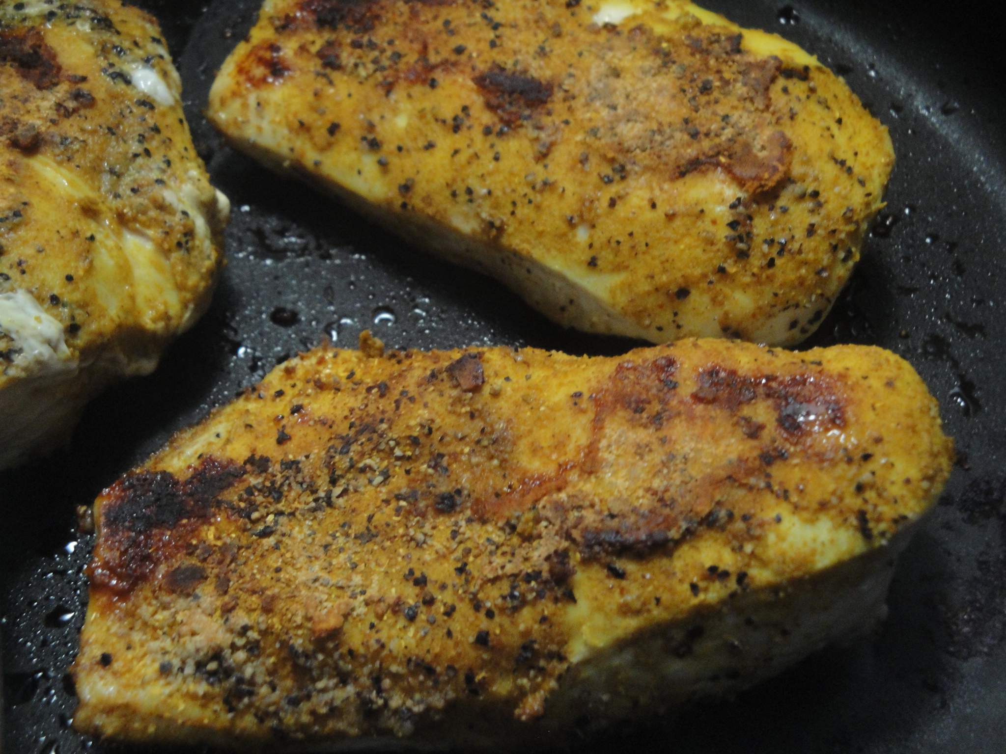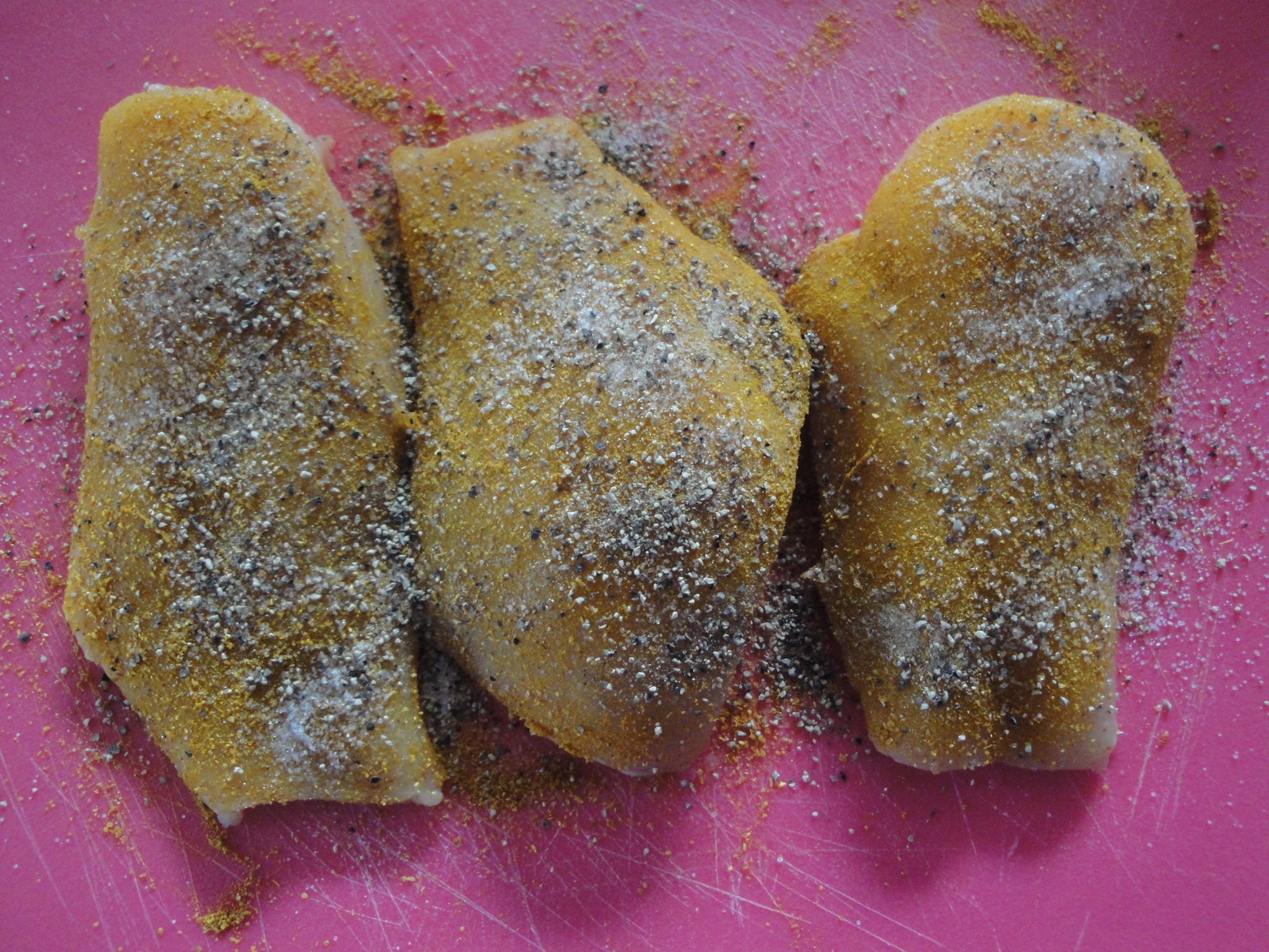 Sprinkle curry powder, salt, and black pepper over chicken (I just put it on one side).