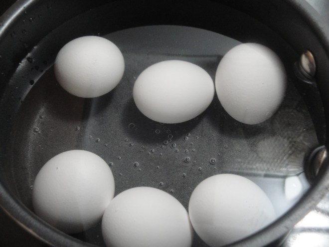 Place eggs in a small pan and cover with water. Bring to a boil, remove from heat and cover. Allow to sit for 11-12 minutes. Cool in ice water.