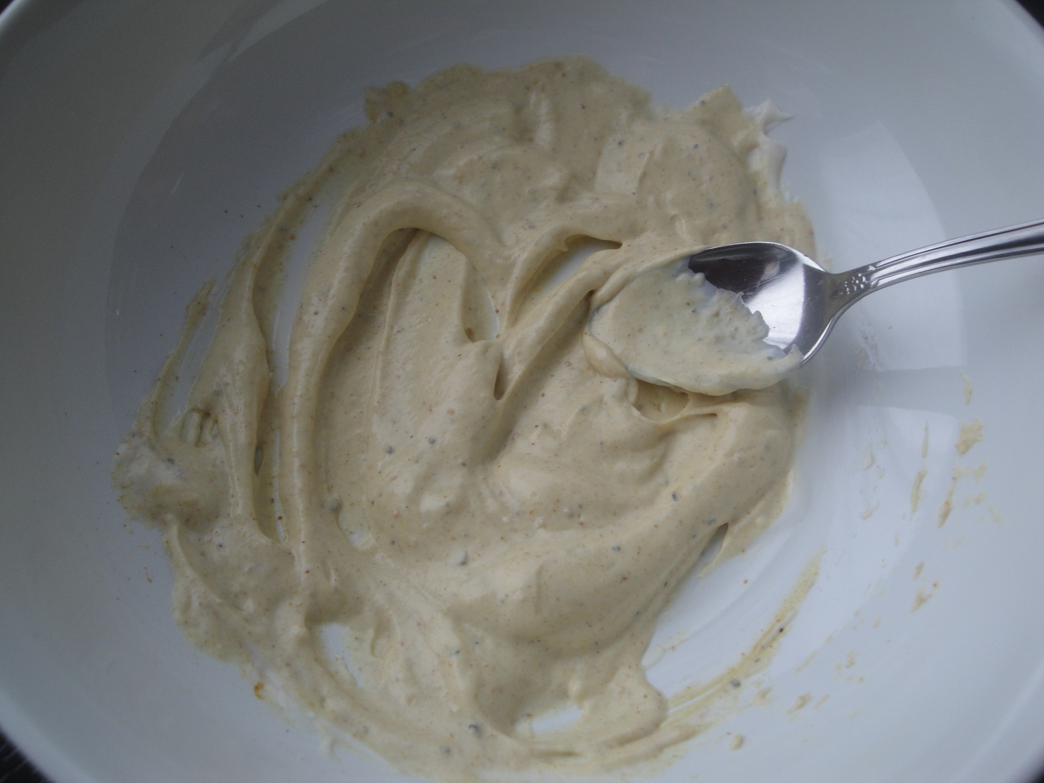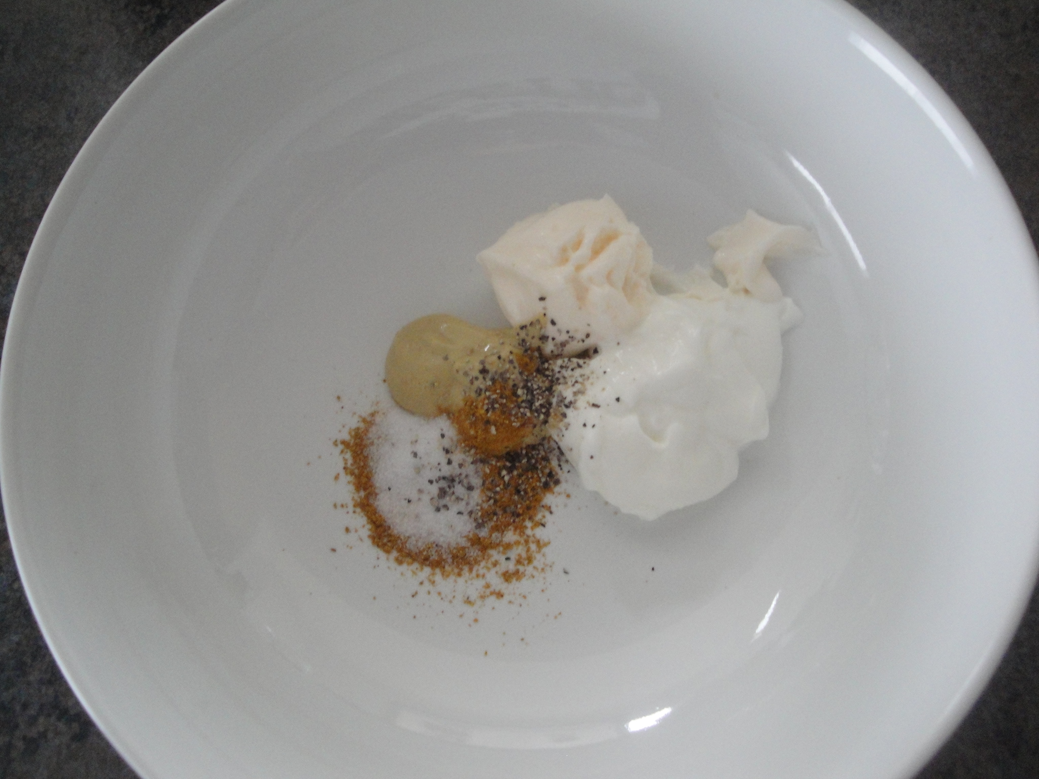 Meanwhile, in a medium bowl, combine light mayonnaise, Greek yogurt, Dijon mustard, curry powder, salt, and pepper.