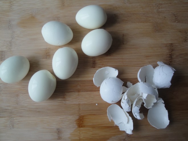 Peel the eggs, rinse, and discard the yolks from two eggs.
