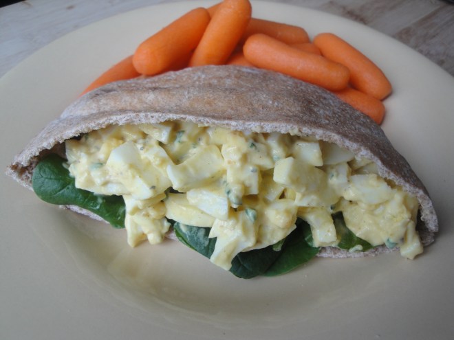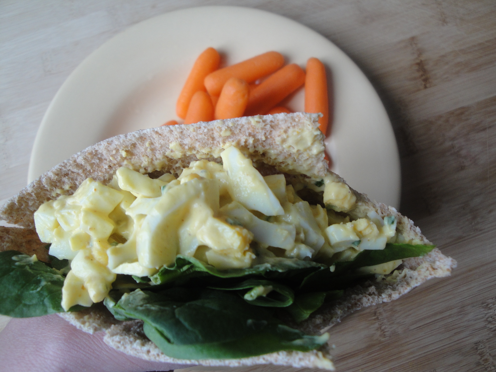 I’m a sucker for hard-boiled eggs. Whether it’s deviled eggs or egg salad sandwiches, I’m all over it. Eggs were a big source of protein for me when I was a vegetarian and egg salad was a staple for me. But, as we all know, any kind of “salad” sandwich – egg salad, chicken salad, pasta salad – usually means tons of mayonnaise and tons of calories. So, I was intrigued when I came across Shape Magazine’s Enlightened Egg Salad Pita. Sounds light and lovely, right?