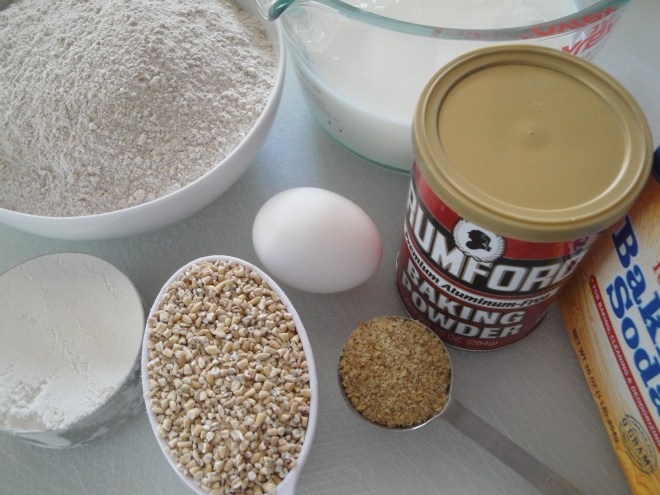 Combine the whole wheat flour, white flour, steel-cut oats, wheat germ, brown sugar, baking soda, baking powder and salt in a large bowl.