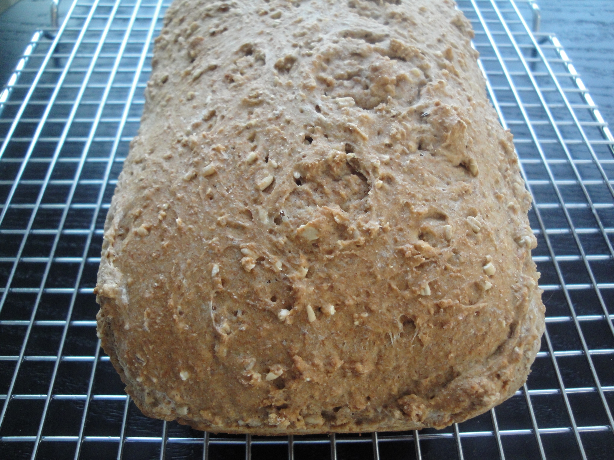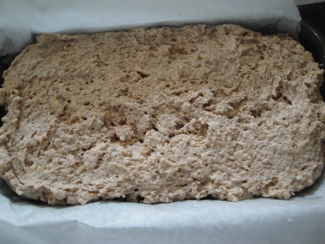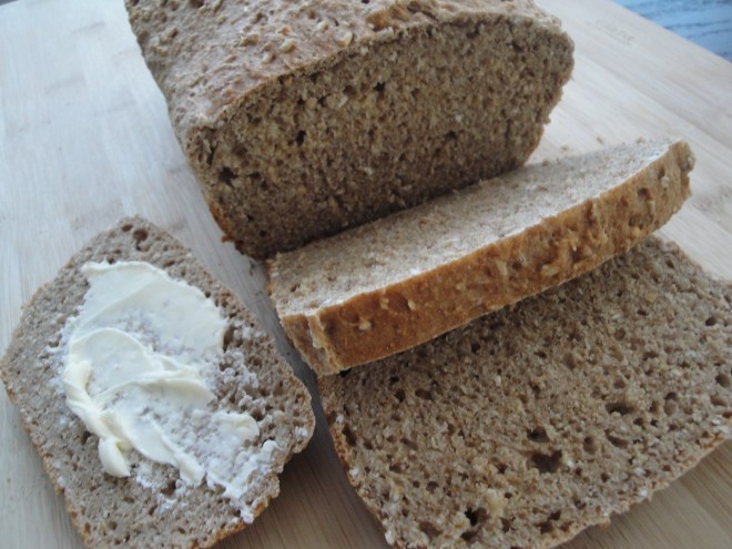 I don’t think I’ve ever had brown soda bread before (also known as Irish Soda Bread) but I’m a fan of the nutritional value of steel-cut oats which are included here. The oats provide a slight nuttiness and depth to this bread which is also filled with whole wheat flour and wheat germ making this a good source of fiber. I hear that some brown soda breads also have raisins which I think would be delicious in here. This was a super-easy bread to prepare and it puffs up in the oven fantastically, making you forget that there is no yeast in it. I like this bread best toasted with a small pat of light butter but I bet it’s even better with a little bit of Irish butter or fruity jam. If you want to have some fresh bread in the house but don’t want to spend hours kneading and rising dough, please give this bread a try. In a little over an hour, your house will be filled with the warm smell of bread.