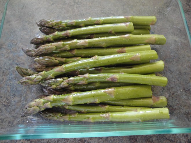 In a shallow dish, toss the asparagus (with ends snapped off) with 1 tablespoon of olive oil and 1/4 teaspoon salt.