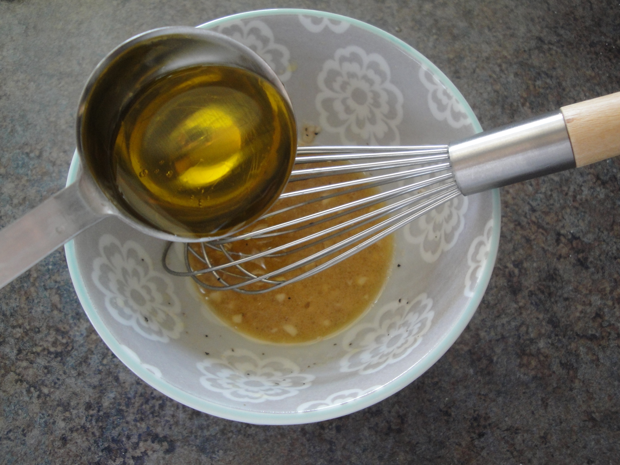 Combine remaining salt, red wine vinegar, dijon mustard, black pepper, and garlic in a small bowl and whisk together. Slowly pour remaining olive oil into vinegar mixture, stirring constantly with a whisk. Stir in capers.