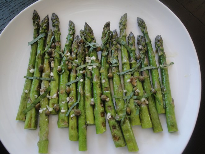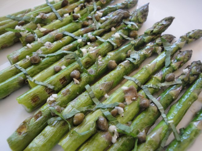 I could eat asparagus just about everyday so it’s important that I find different ways to enjoy this healthy green vegetable. While I generally enjoy it simply steamed, I like to switch things up a bit and throw these spears a little curveball, like this Grilled Asparagus with Caper Vinaigrette. Fresh asparagus is grilled with olive oil and salt before being drizzled with a vinaigrette of red wine vinegar, olive oil, garlic, dijon mustard, and capers. The capers provide a subtle briney, salty punch while the viniagrette itself is garlicky and light. A sprinkling of fresh, sweet basil rounds out this Spring side dish which is good eaten warm or cold. I definitely plan on making this again!