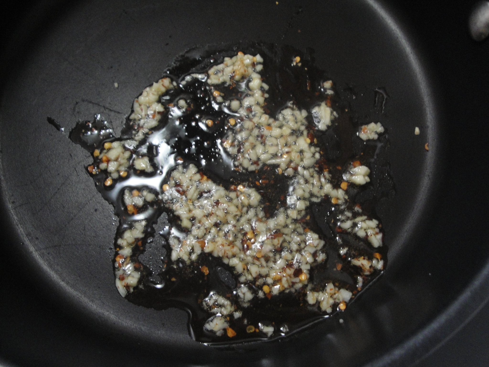 Prepare green beans by either cooking in a microwave according to package directions or on the stove (cook in boiling water for 5 minutes). Sauté garlic and red pepper flake in sesame oil in a skillet over medium-high heat for 30 seconds.