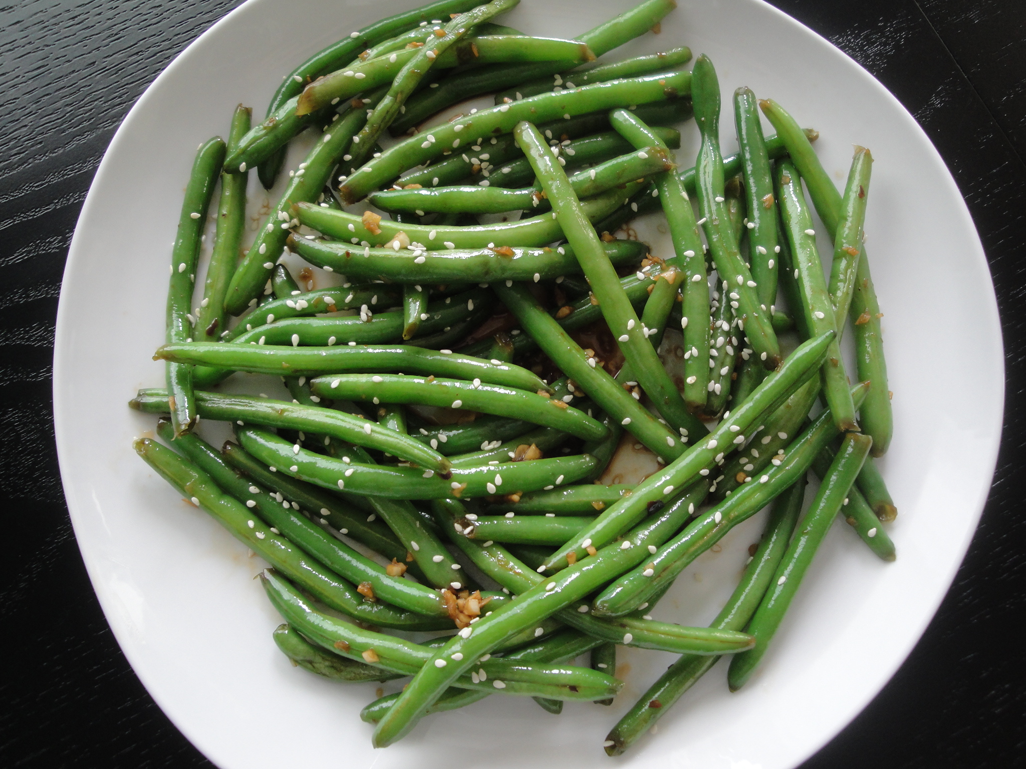 As I mentioned a few days ago, I’ve got an Asian-inspired veggie which makes for a really tasty side dish. Since I’m pretty picky when it comes to veggies, I’m always looking for different ways to prepare the ones that I like so I don’t get so bored with them, I give up eating them altogether! What a better way to liven up some green beans than with a little bit of salty soy? That’s exactly what these Sesame-Soy Green Beans are. Bright green beans are cooked and tossed with a mixture of soy sauce, garlic, and red pepper flakes before being sprinkled with nutty toasted sesame seeds. I don’t know what it is about the combination of soy sauce and garlic but if you put in in a martini glass, I just might drink it. But I digress…I love bagged veggies (even if they are a little more expensive) because it just helps speed things up but use whatever green beans you like here. Consider this preparation with other veggies too, like broccoli, cauliflower, asparagus, spinach or brussel sprouts. Yum!