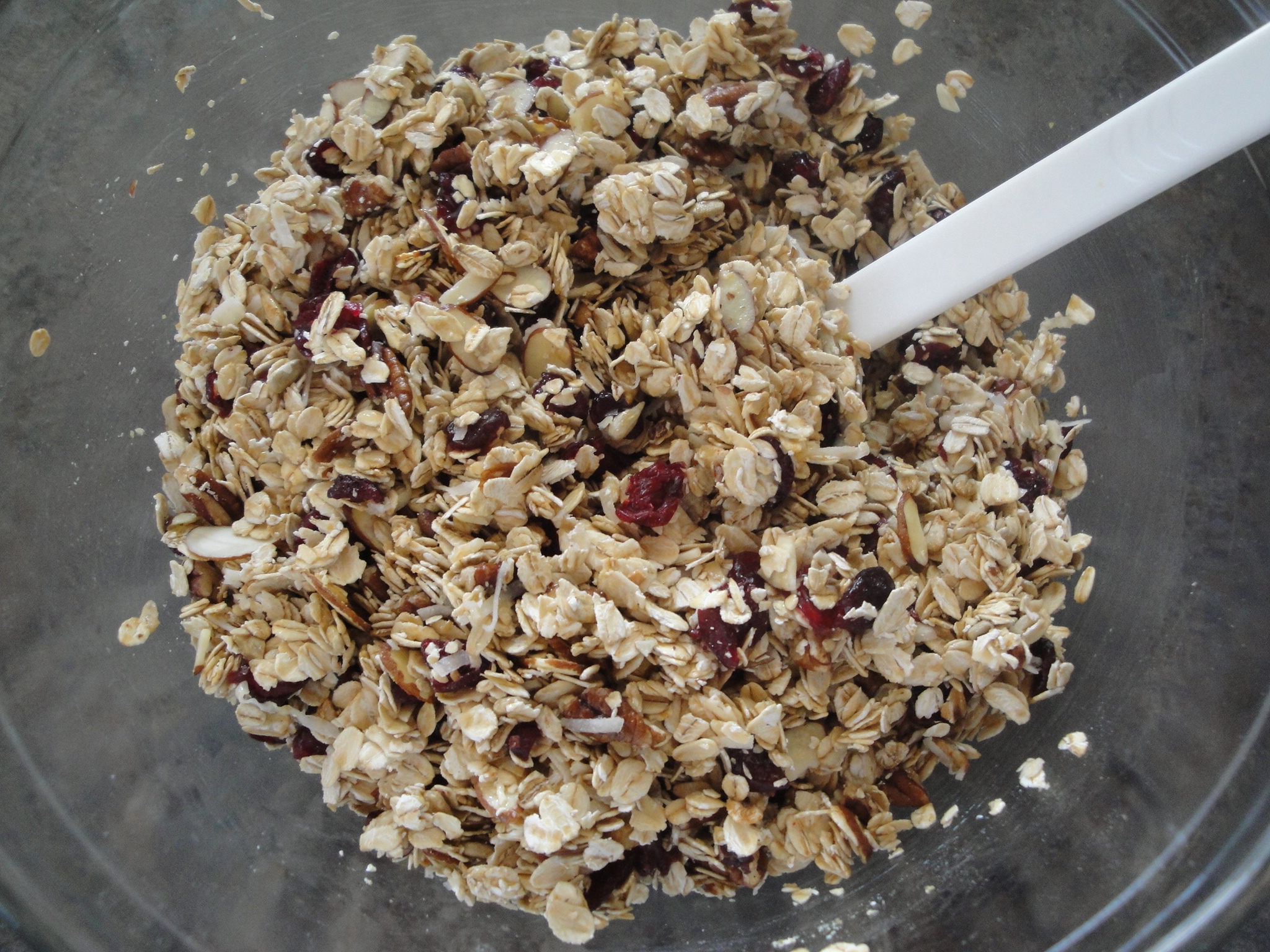 Combine all of the ingredients, except dried fruit, in a pan or bowl and toss until well combined. (I didn’t read the directions correctly and added the dried fruit here. It worked out okay but try to add the fruit at the end.)