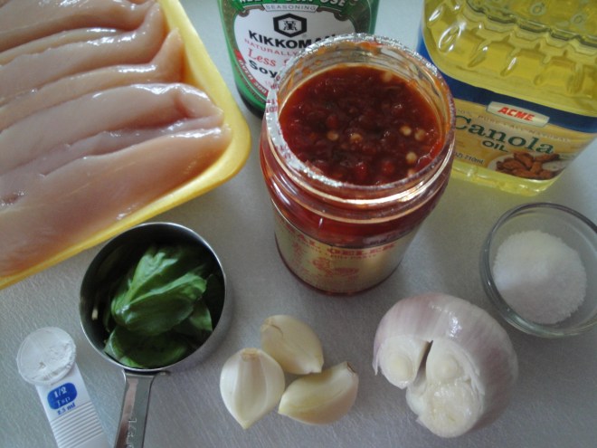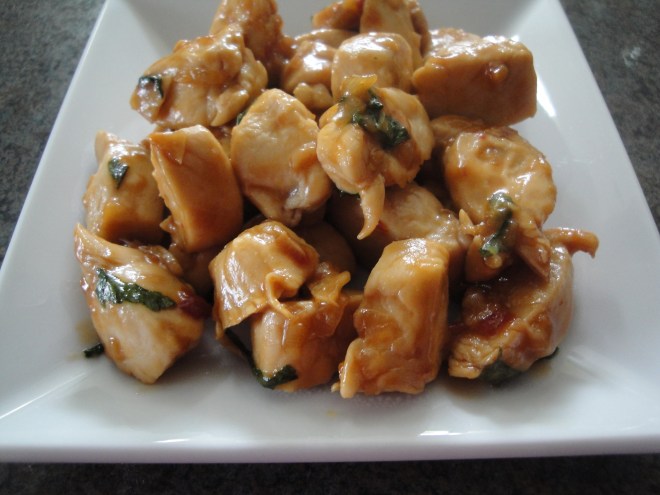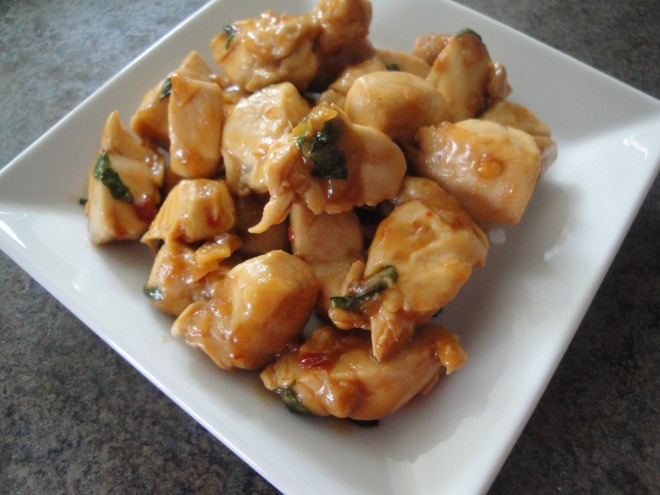 So, true to form, on Sunday I decided to make a nice low-carb chicken dish – Spicy Basil Chicken. Tender chicken is cooked with shallots and sliced garlic before being bathed in a spicy and salty mixture of soy sauce, chili paste, sugar, water, and cornstarch. Sliced basil tops off the whole dish, giving it a fresh, bright finishing touch. This tasted like an authentic chicken dish that I might get at my favorite Chinese food place, slightly reminiscent of Kung Pao. No matter how good the chicken was though, it was made even better by the soft garlic slices that soaked up the sauce. I probably could have eaten that garlic by the spoonful. In fact, I just might have. This dish is soooooo much better than fast food!